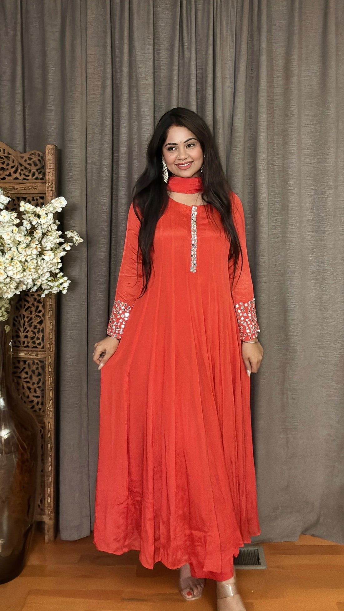 Step into timeless elegance with the Aarvi Chinon Mirror Anarkali Suit. Crafted in luxurious Chinon...