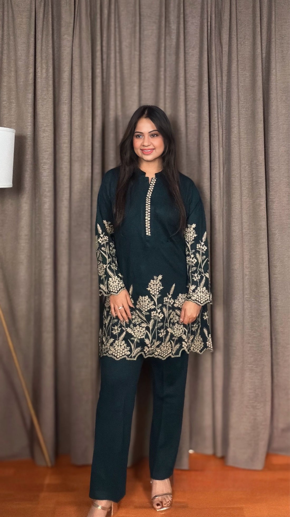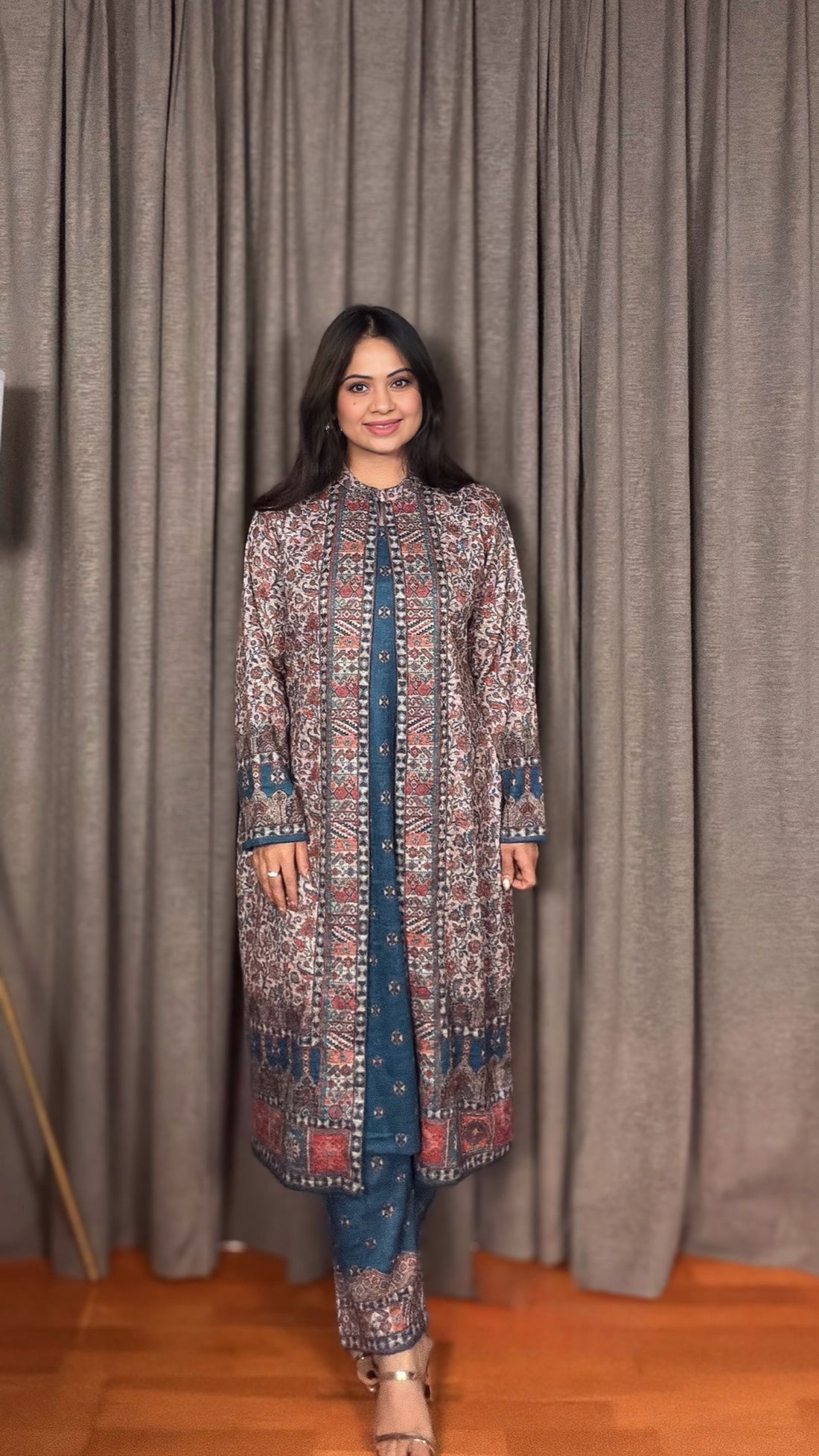 Nayra brings timeless winter elegance in a rich deep turquoise woolen fabric, adorned with beautiful...