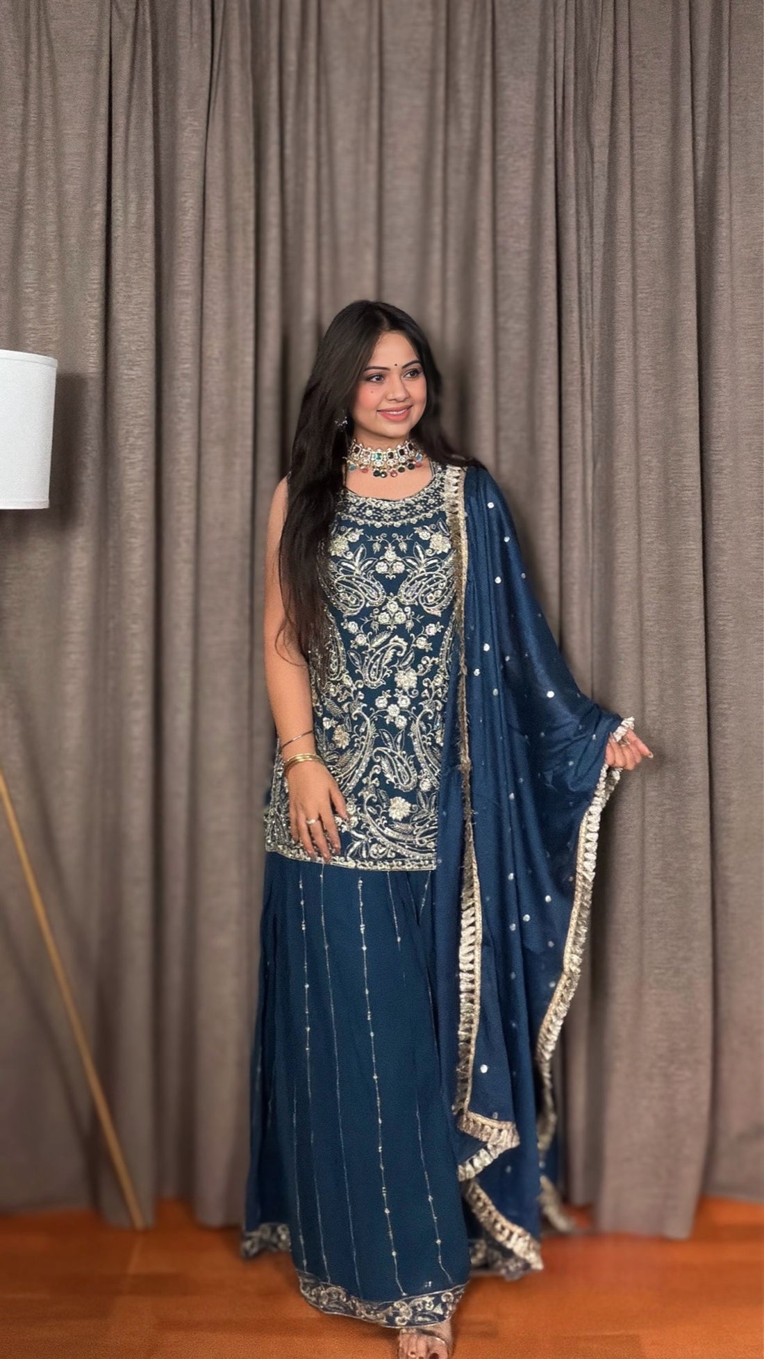 Elevate your festive glam with Zayla Azure, a breathtaking georgette sharara set drenched in deep...