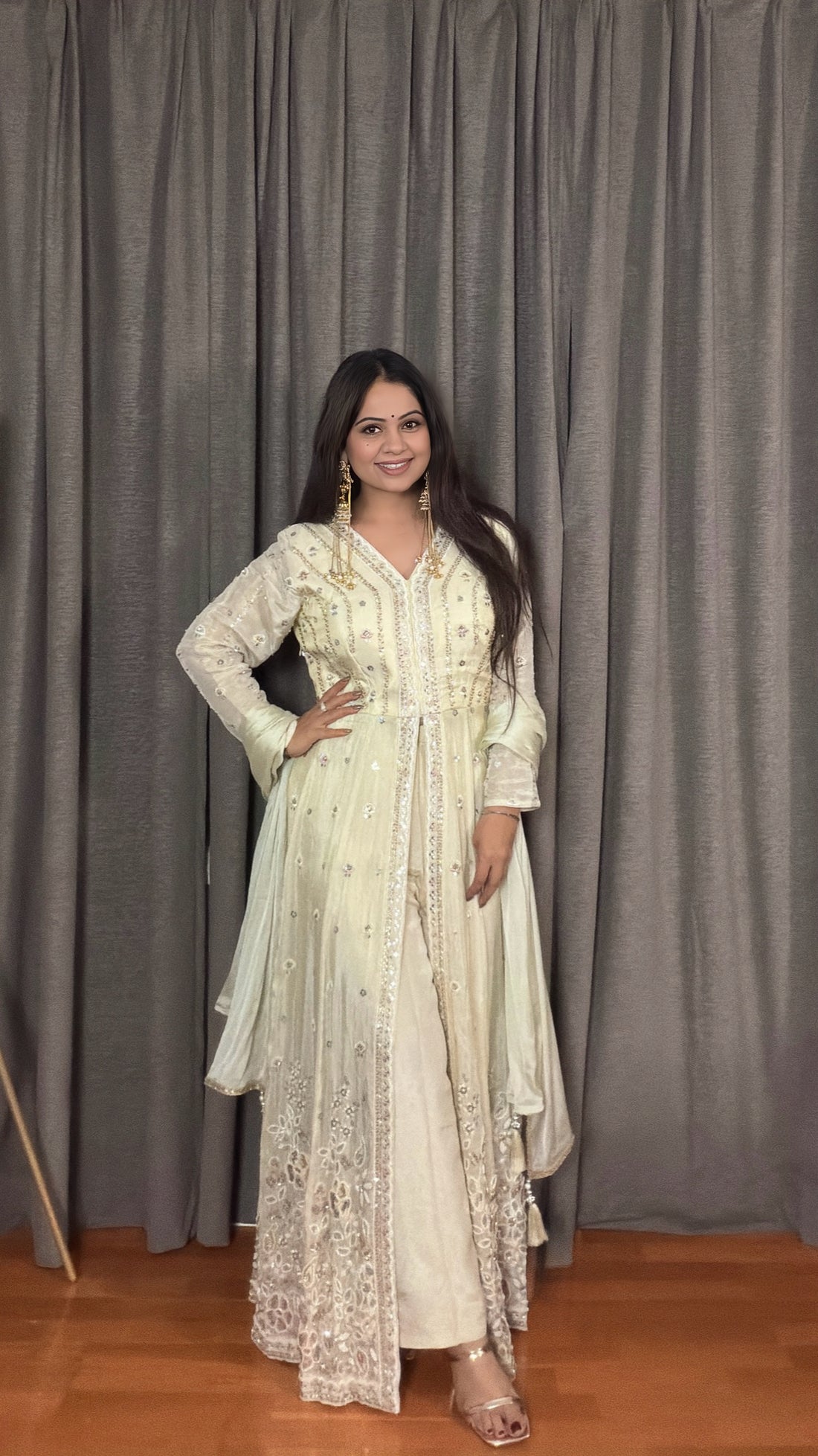 Step into elegance with the Aarvi Sea Green Anarkali. Crafted in soft Dola Silk, this...
