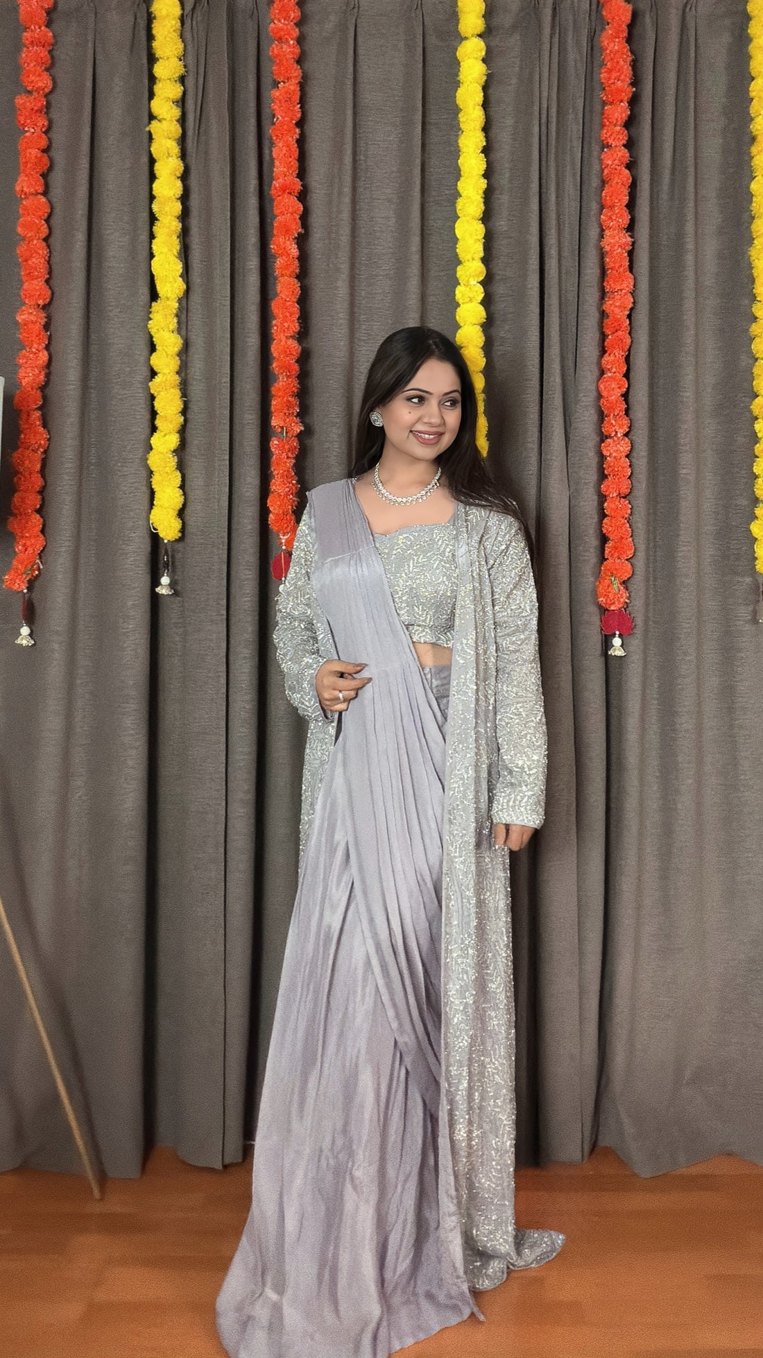 Sophisticated and striking, Vanya blends traditional elegance with modern glamour. This lilac Indo-Western saree features...