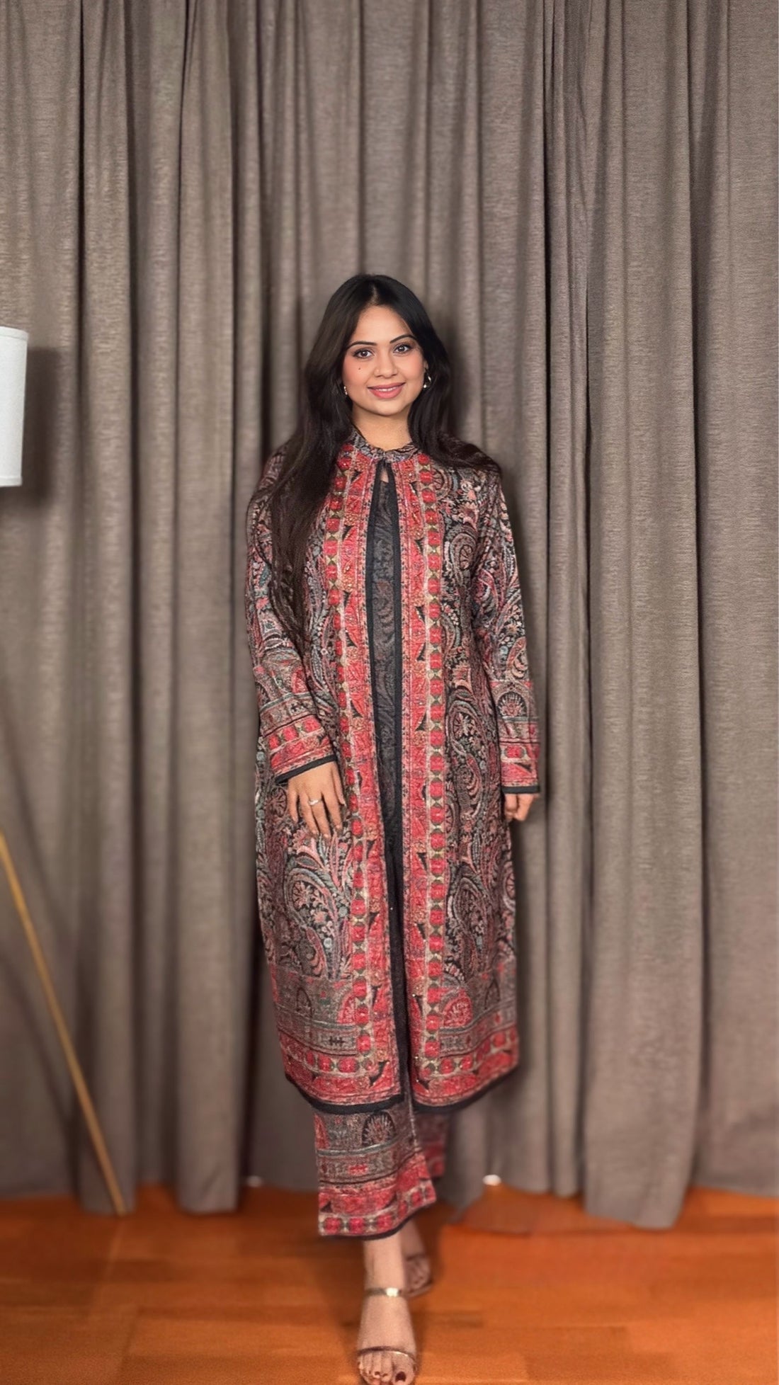 Wrap yourself in winter elegance with Rivya, a luxurious woolen cord set featuring rich Kashmiri-inspired...
