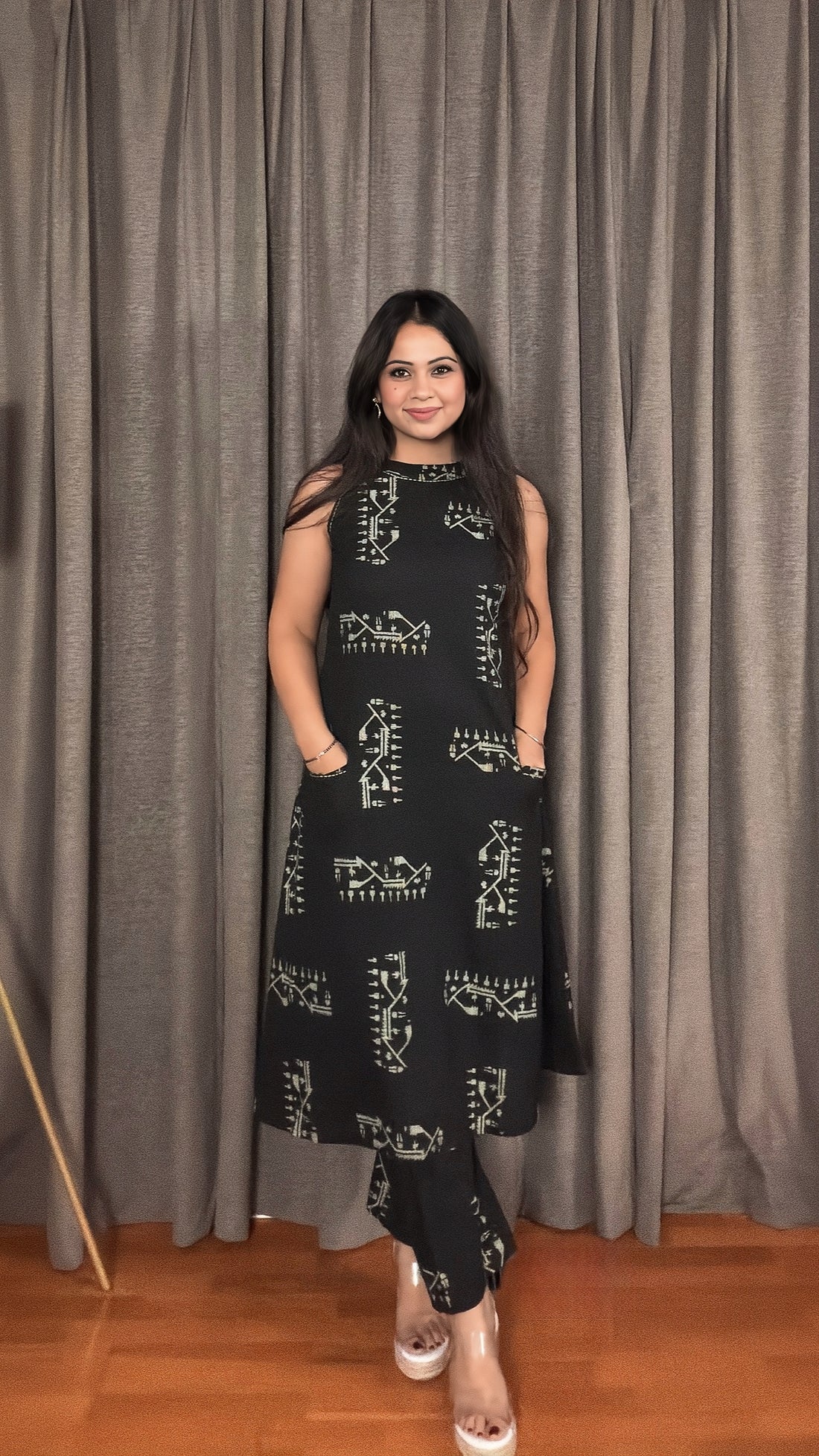 Elegant Ajrak print crafted on breathable pure cotton fabric Sleeveless kurta paired with matching straight-cut...