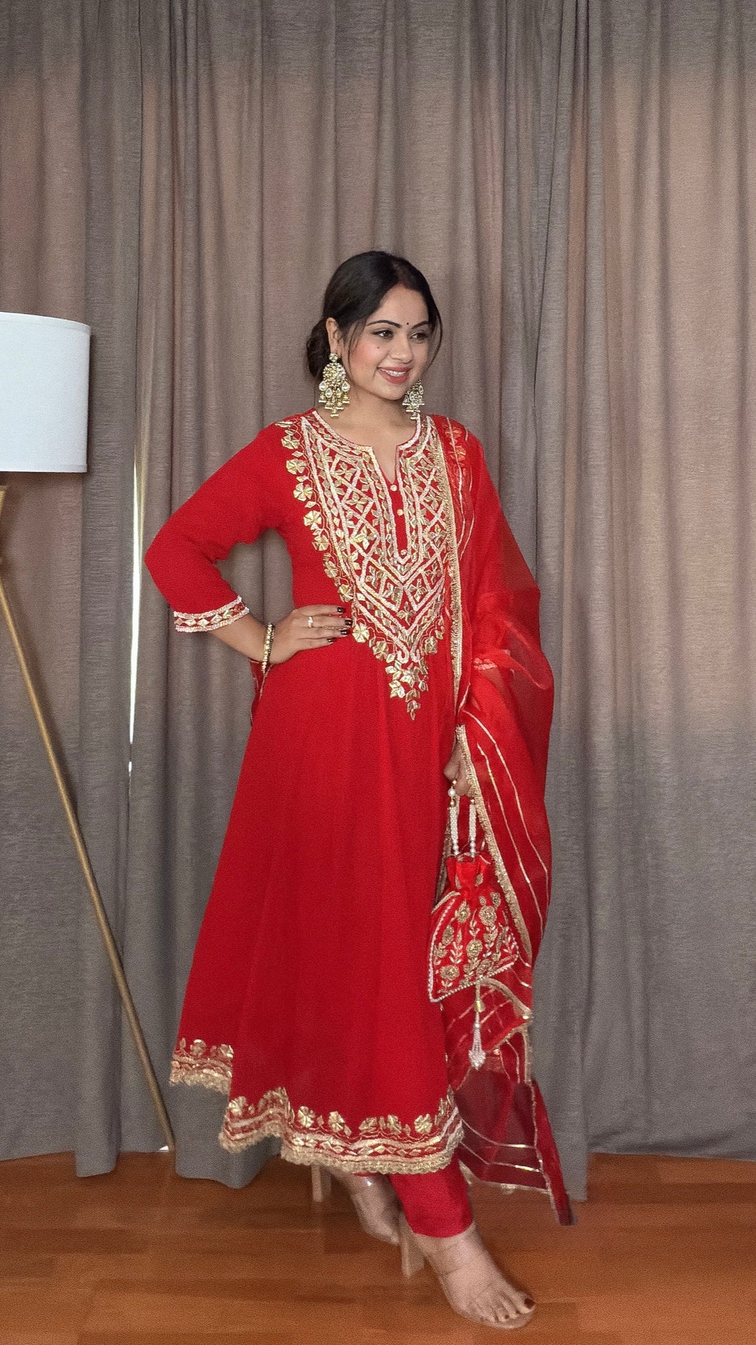 Step into timeless grace with the Ruhira Red Georgette Anarkali Suit. Crafted from flowy georgette,...