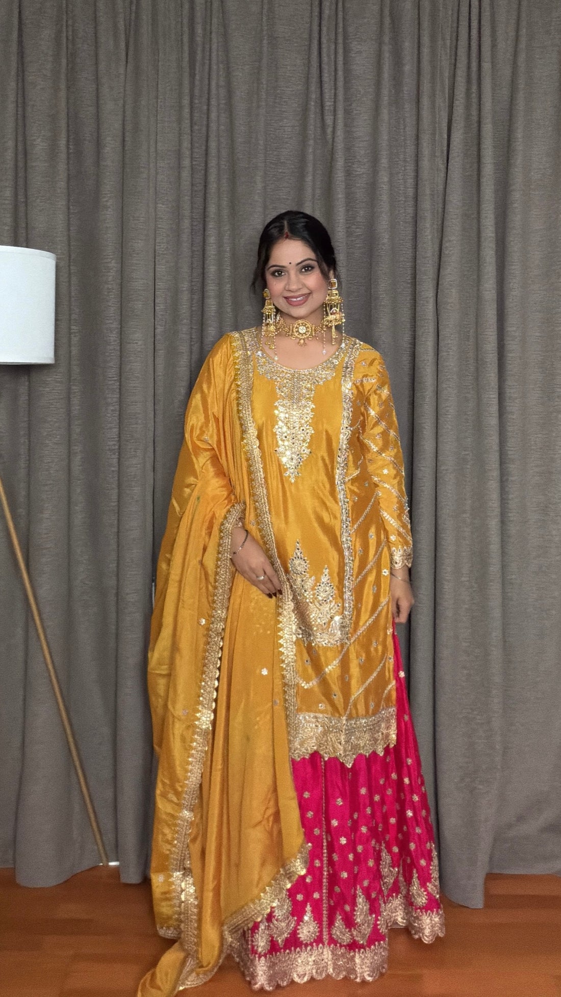 Radiate sunshine and sophistication with Suhana, a stunning yellow and pink Chinon silk lehenga suit...
