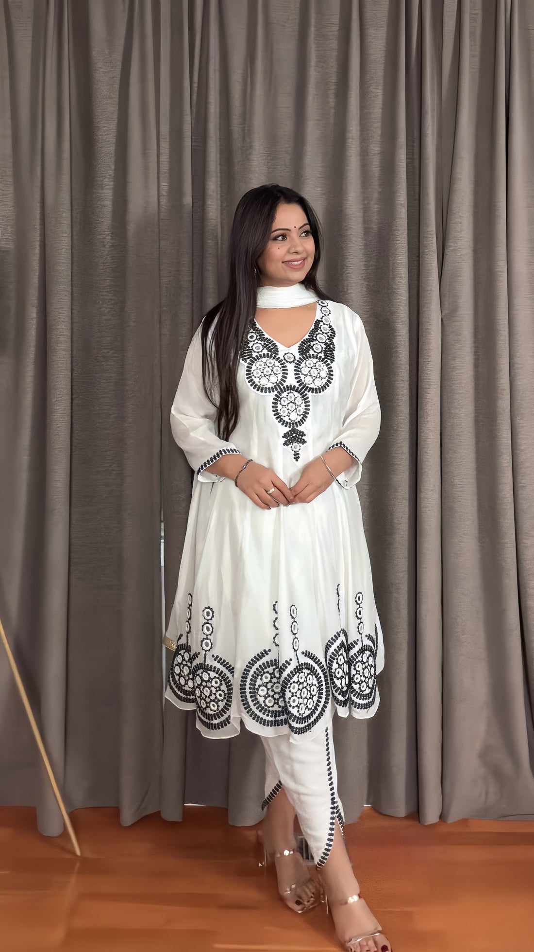 This short-length Anarkali in pristine white chinon is a graceful fusion of tradition and trend....