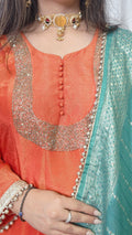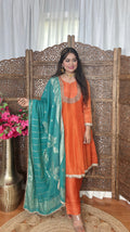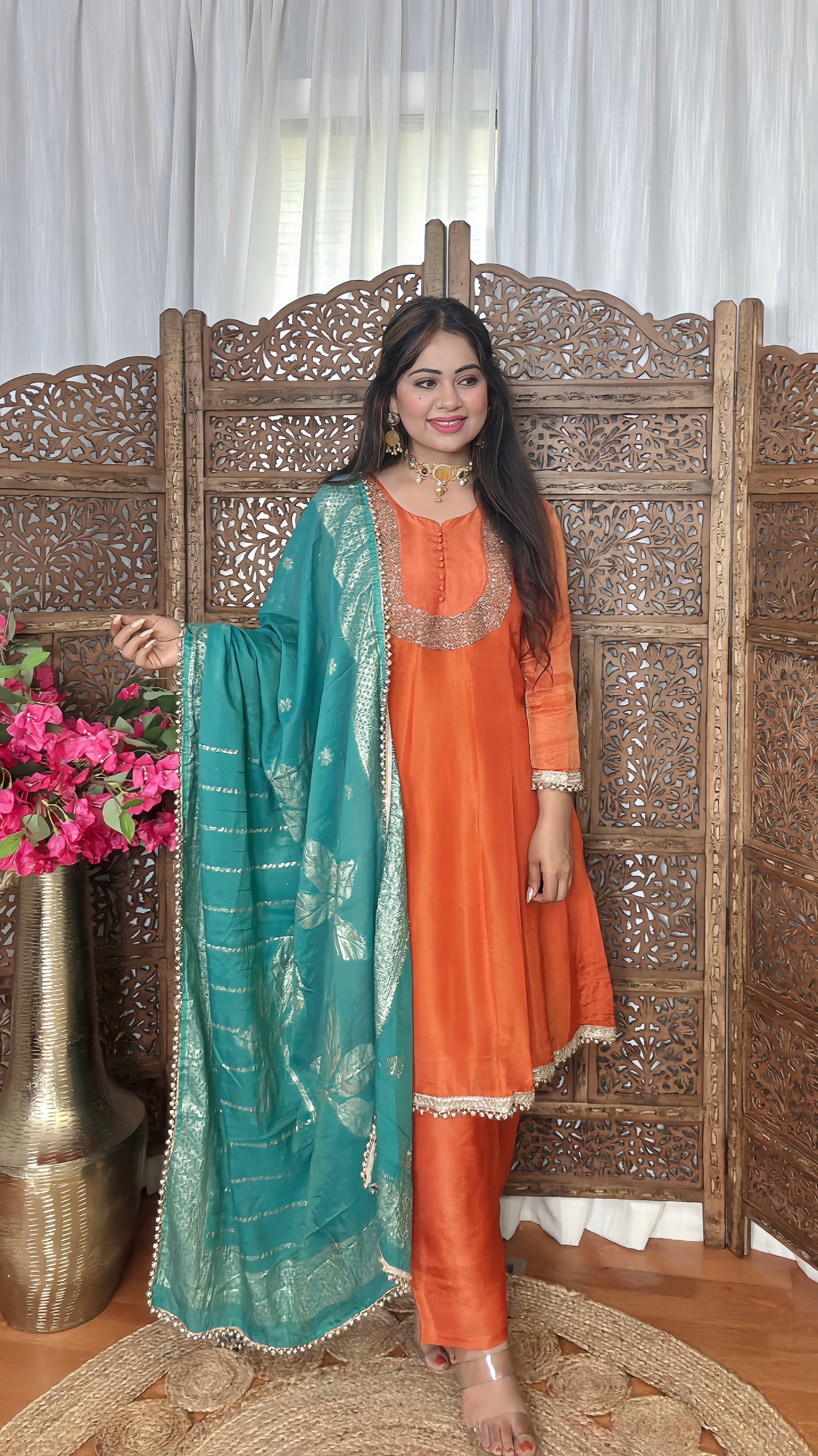 Step into festive elegance with the Aarohi Noor Tissue Anarkali Set, a perfect fusion of shimmer and tradition. The short Anarkali kurta in orange tissue fabric glows with a soft shimmer, beautifully contrasted with straight-fit pants in the same warm hue. The highlight is the stunning teal green Banarasi woven dupatta that adds a regal touch with its rich zari weave. Delicate handwork embroidery on the neckline adds grace and sophistication, making it the ideal ensemble for festive gatherings, intimate weddings, or evening celebrations.
