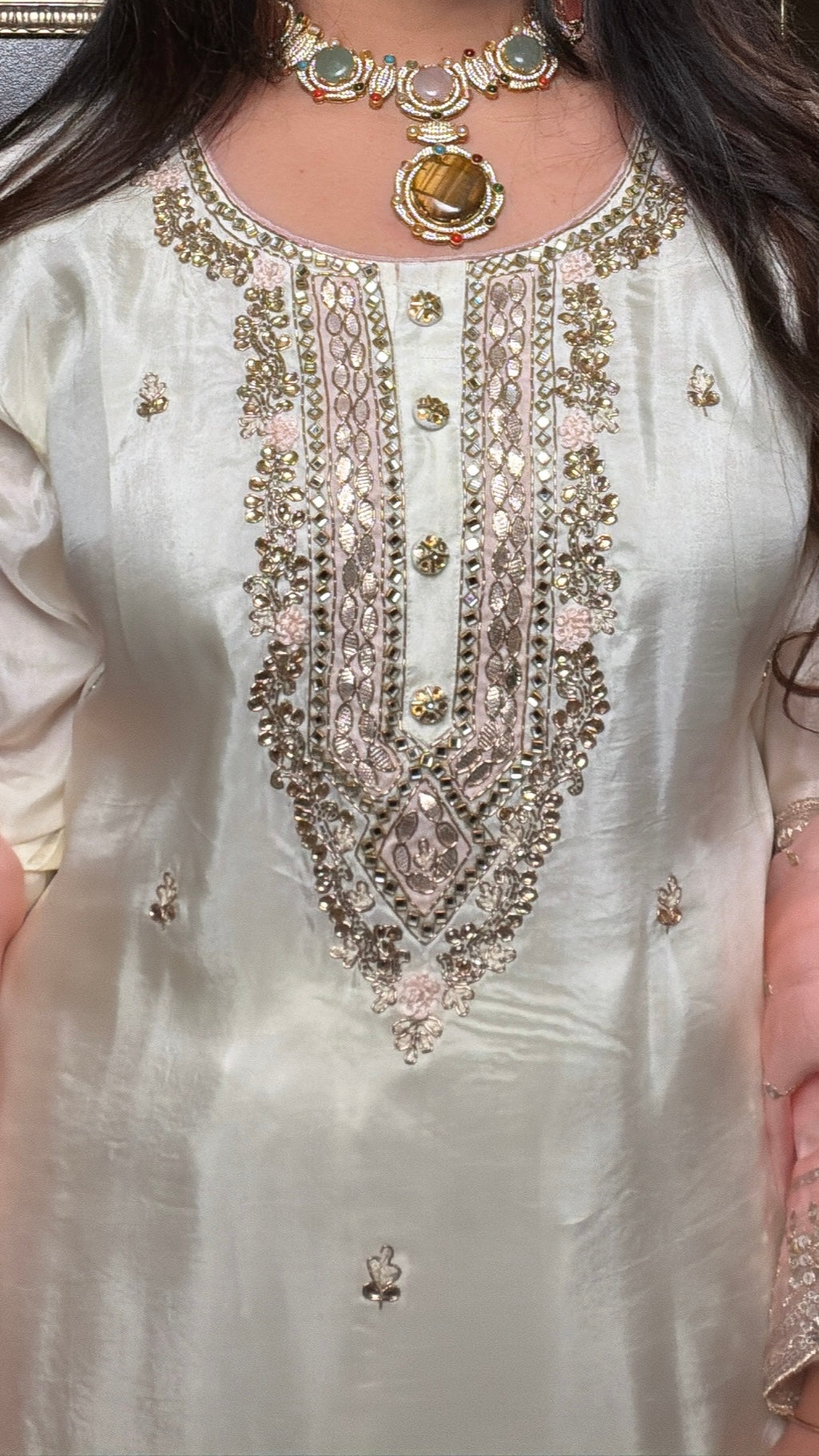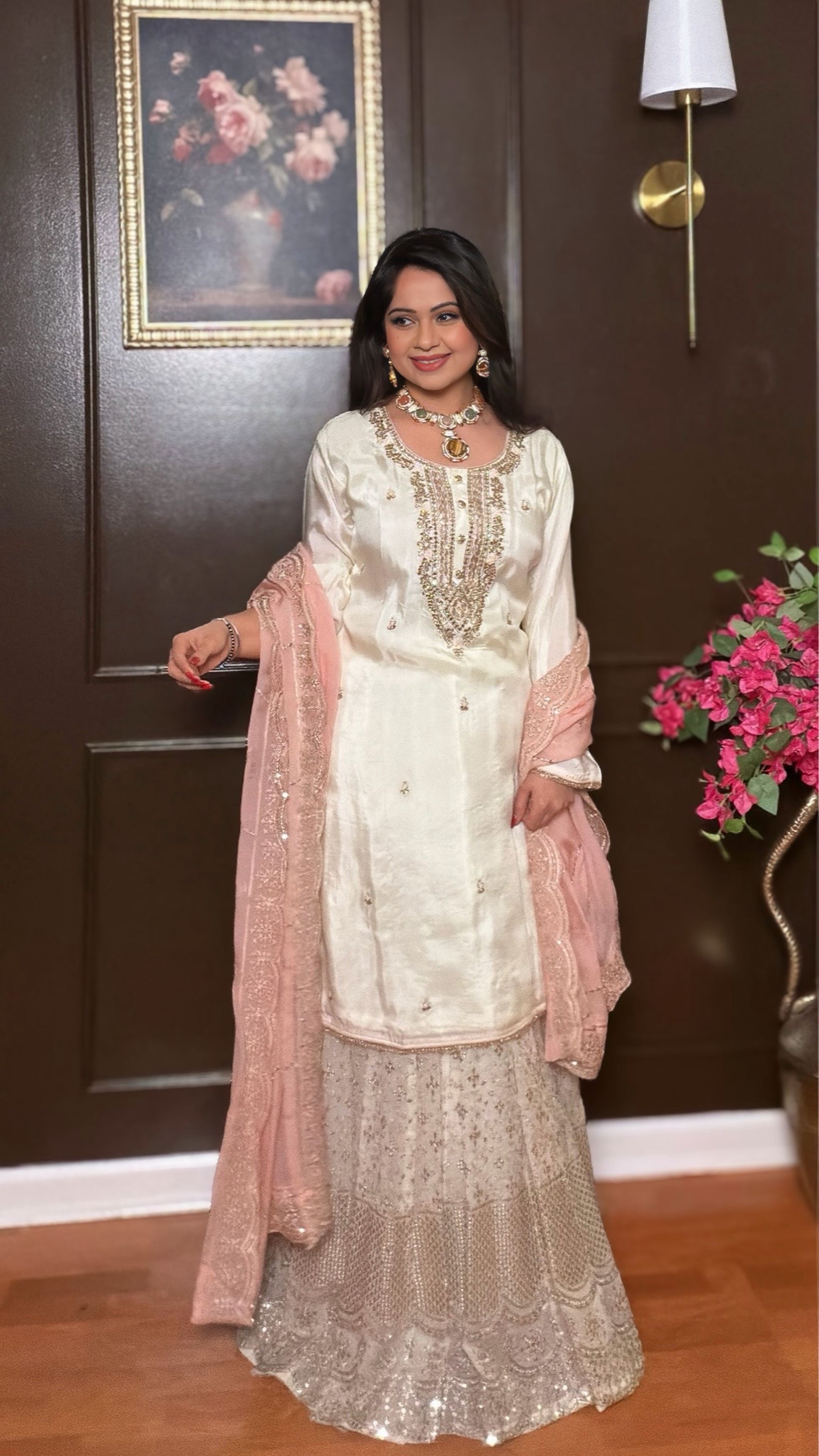 Introducing Aavr ina, a luxurious pure silk skirt set designed for timeless festive elegance. This beautifully crafted ensemble features a premium pure silk kurta highlighted with exquisite Kundan detailing on the neckline, adding a regal touch to the overall look. The kurta is paired with a graceful georgette skirt adorned with zari and sequin work, creating soft shimmer and movement with every step.