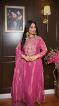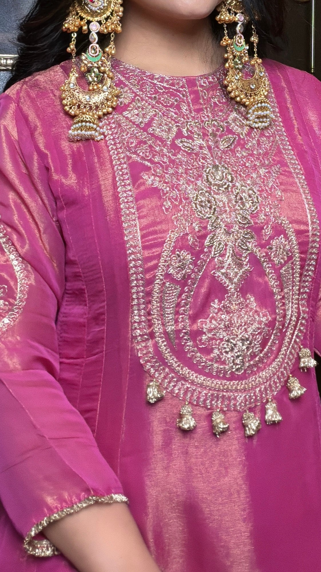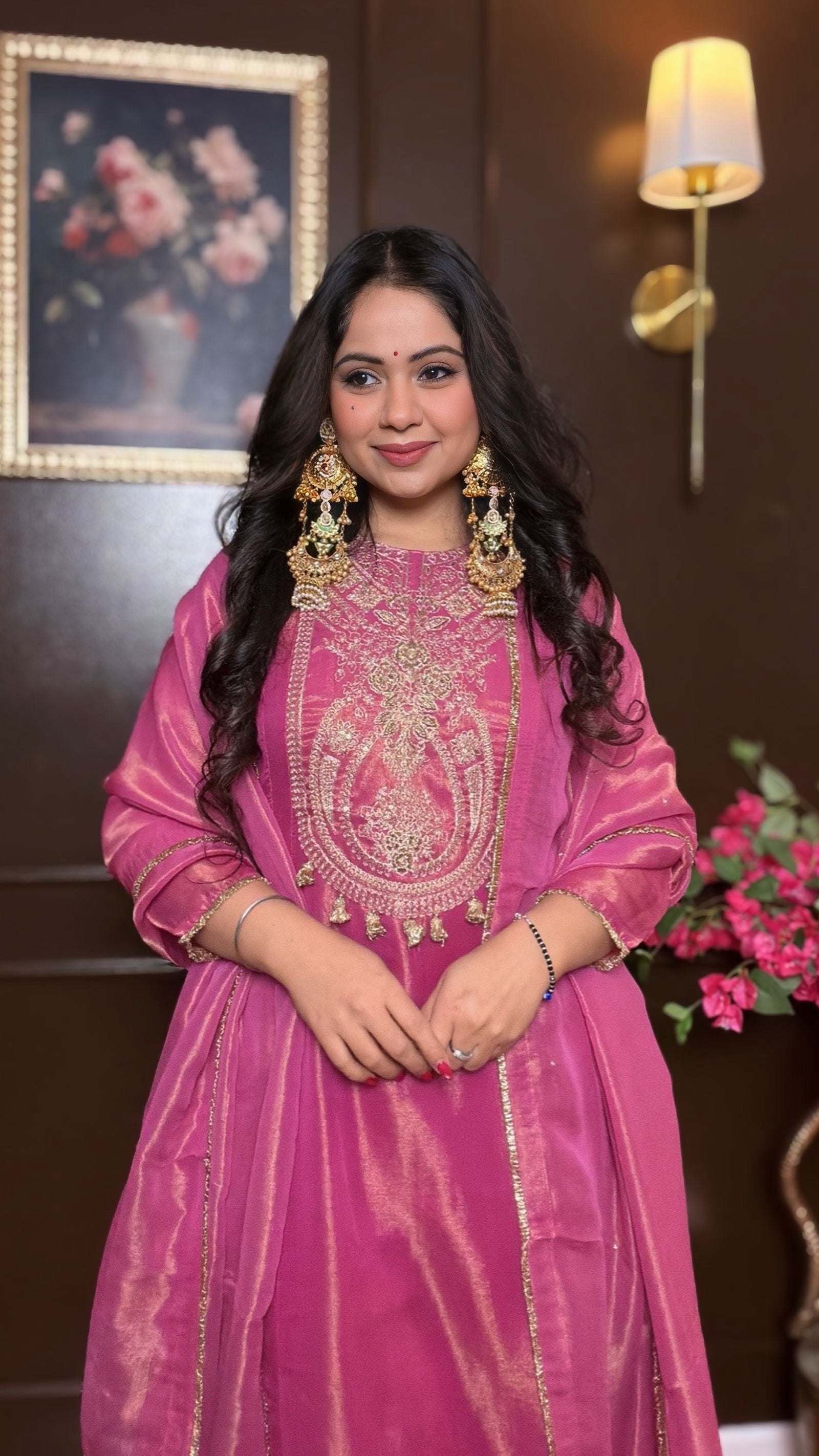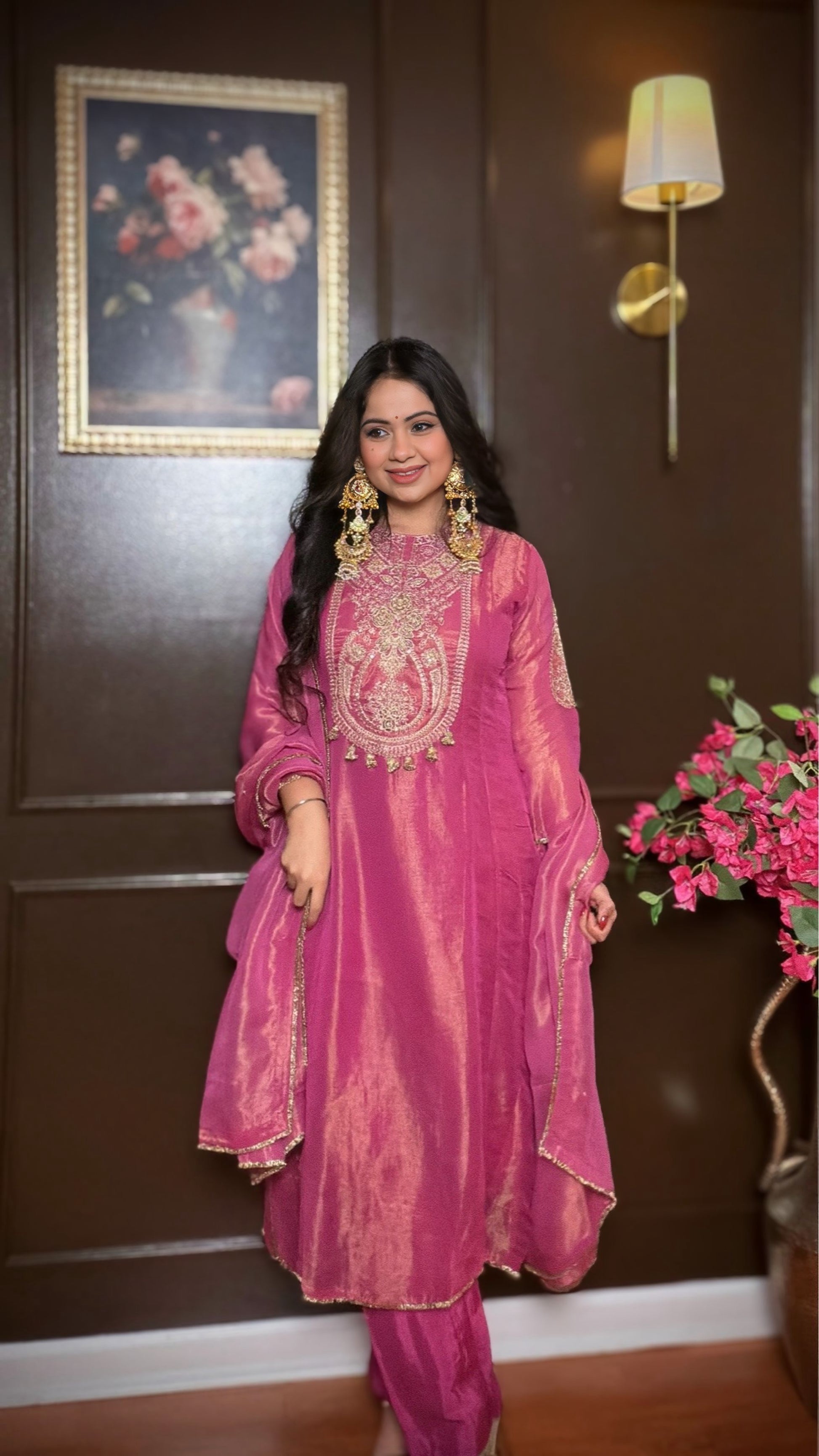 Aireva is a timeless festive ensemble crafted in luxurious tissue shimmer fabric with a soft radiant finish. The kurta is beautifully adorned with intricate zari and hand embroidery on the neckline, creating a rich and elegant focal point. The flowy silhouette paired with matching pants and a coordinated tissue dupatta makes this set perfect for graceful festive and evening occasions.