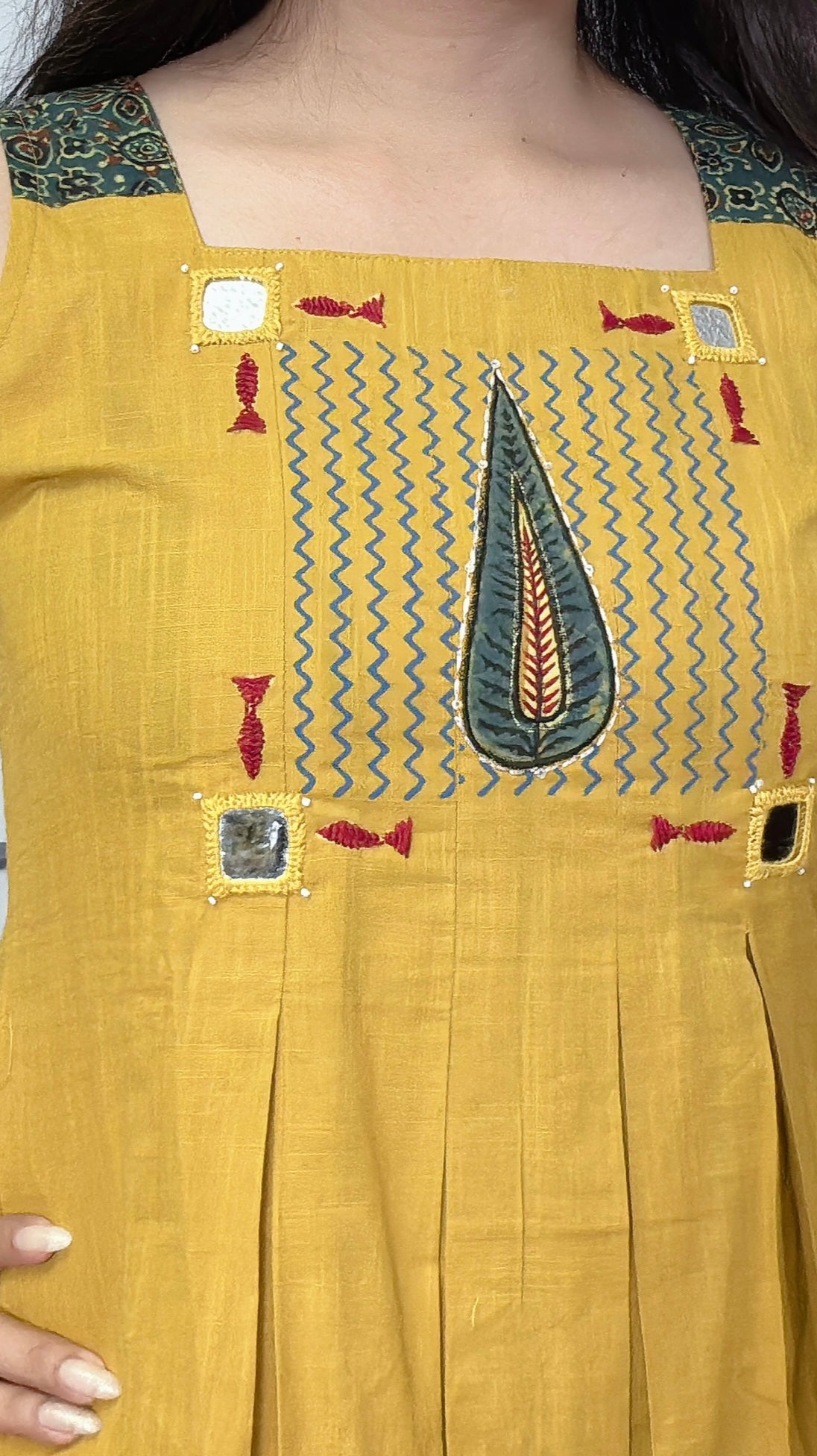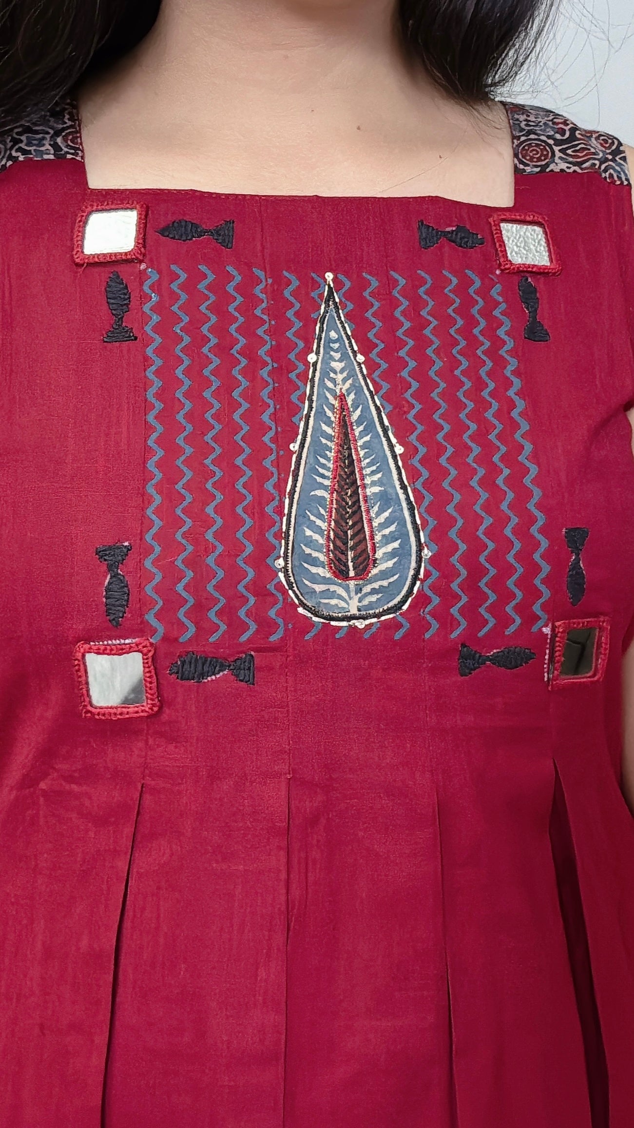 - Traditional Detailing: Ajrak print with mirror work for a handcrafted look