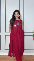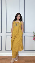 Step into earthy elegance with the Ajrak Noor Mirror Set. Crafted from breathable cotton, this sleeveless kurta-pant set features traditional Ajrak-inspired design with mirror detailing along the neckline. The kurta comes with convenient pockets and a comfortable 45-inch length, paired with straight-fit pants. Available in two stunning shades – classic red and vibrant yellow – this outfit blends comfort with cultural charm.