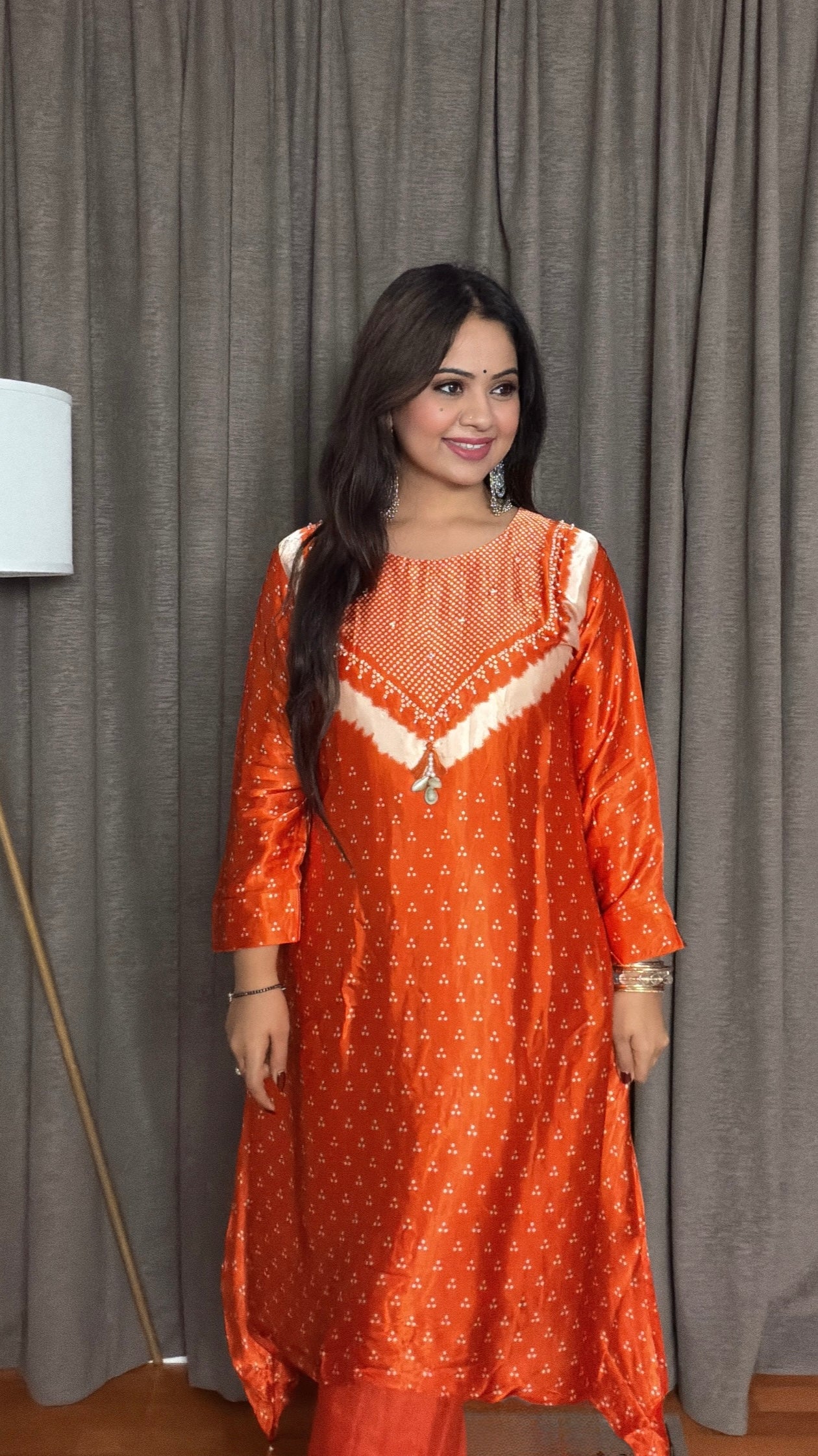 Infuse your wardrobe with the festive warmth of Amber Bandhej, a stunning orange Gajji silk co-ord set designed for modern comfort and traditional charm.