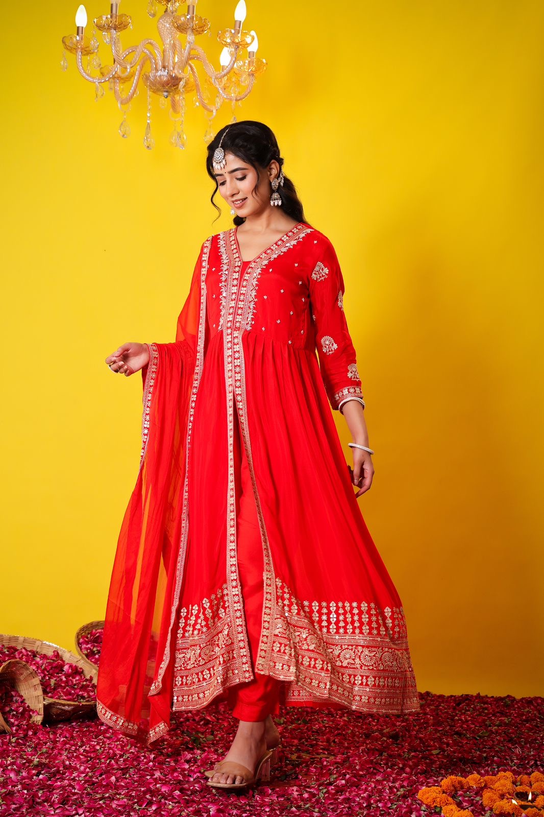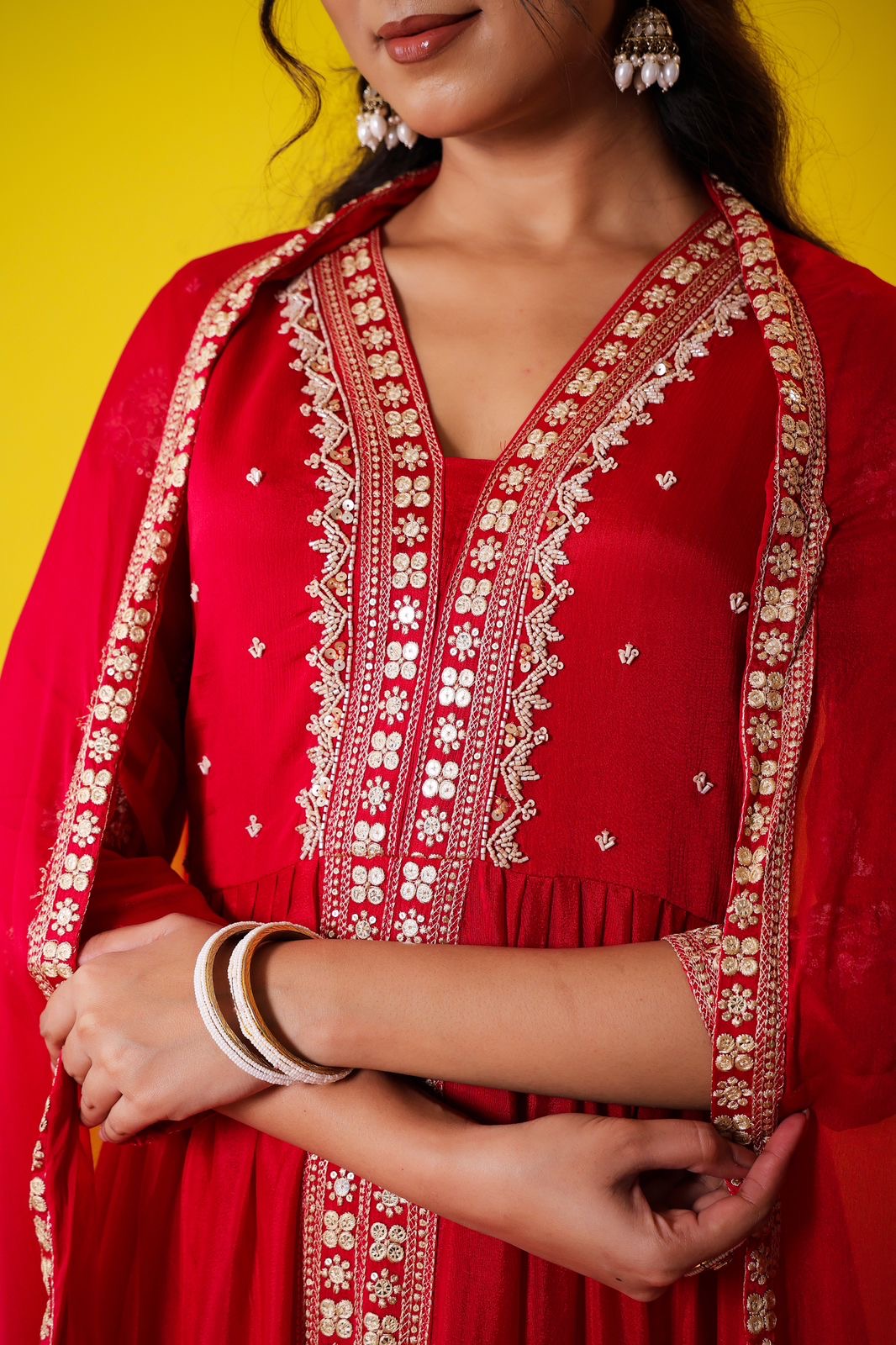 Command attention with the Amirah Anarkali, a masterpiece in rich red chinon silk. Adorned with intricate zari, sequins, and pearl embroidery, this 53-inch front-slit design blends traditional artistry with modern elegance. Paired with tailored muslin silk pants and a matching dupatta, it’s the ultimate ensemble for karwachauth festivities, weddings, festive nights, and grand celebrations.