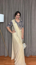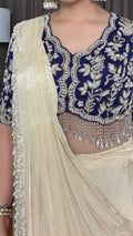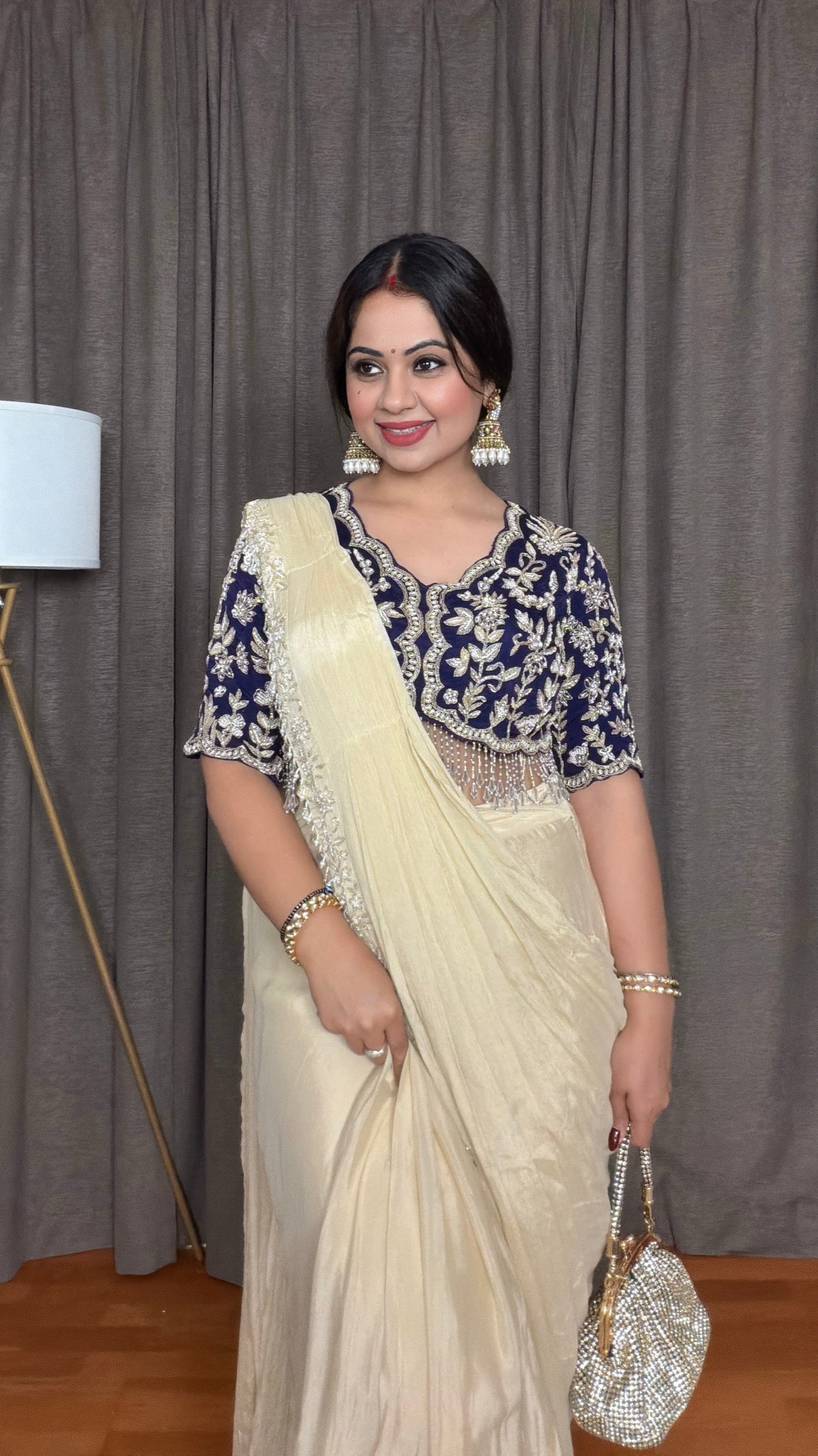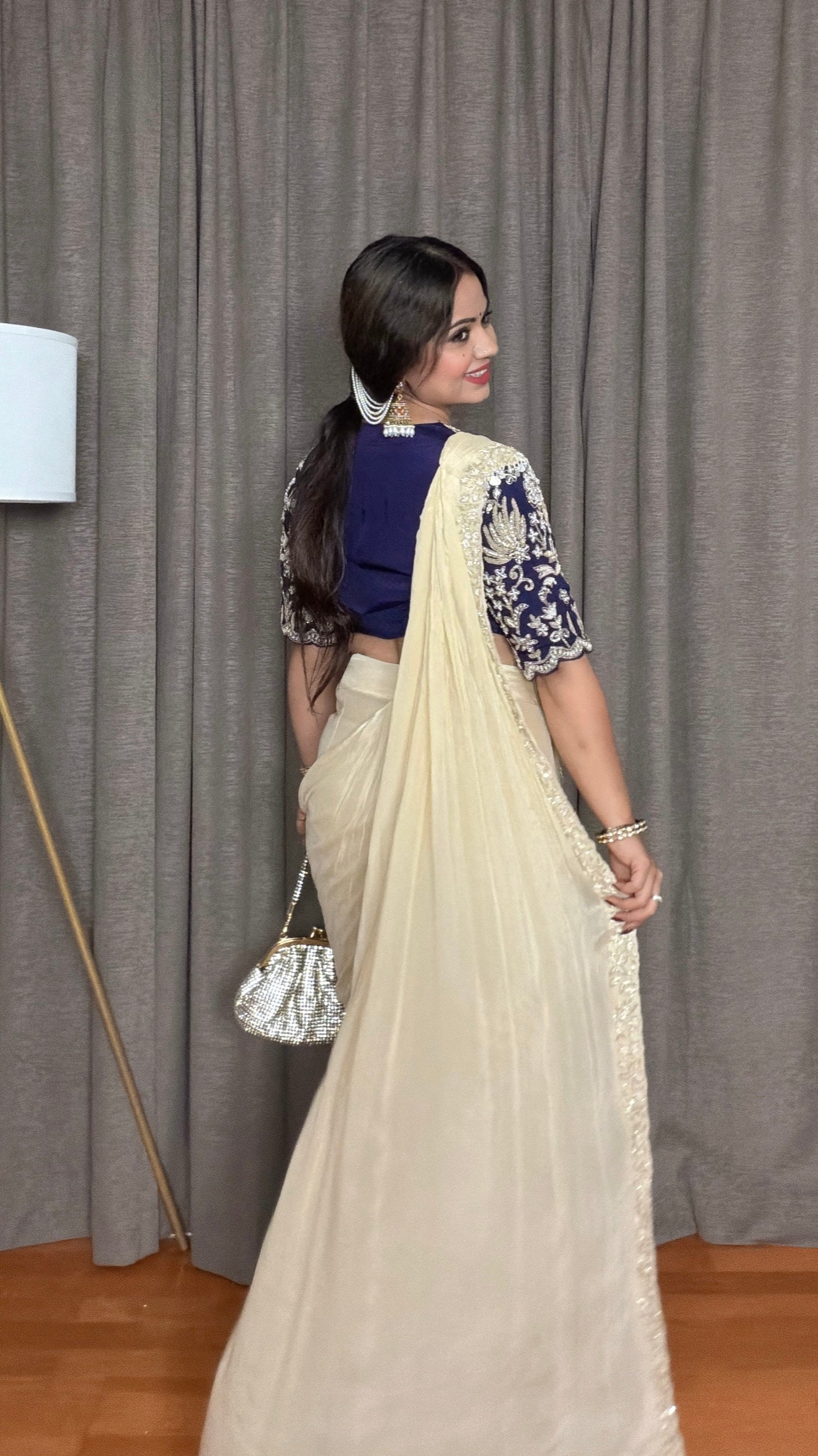 Step into modern elegance with the Arzaya Georgette Pre-Stitched Saree. Crafted in soft ivory georgette, this saree features a pre-stitched drape for effortless styling. The highlight is the magnificent violet blouse adorned with intricate hand embroidery and delicate pearl hangings, creating a graceful and luxurious look. Blouse length: 45 inches. Perfect for festive occasions, weddings, and special celebrations.