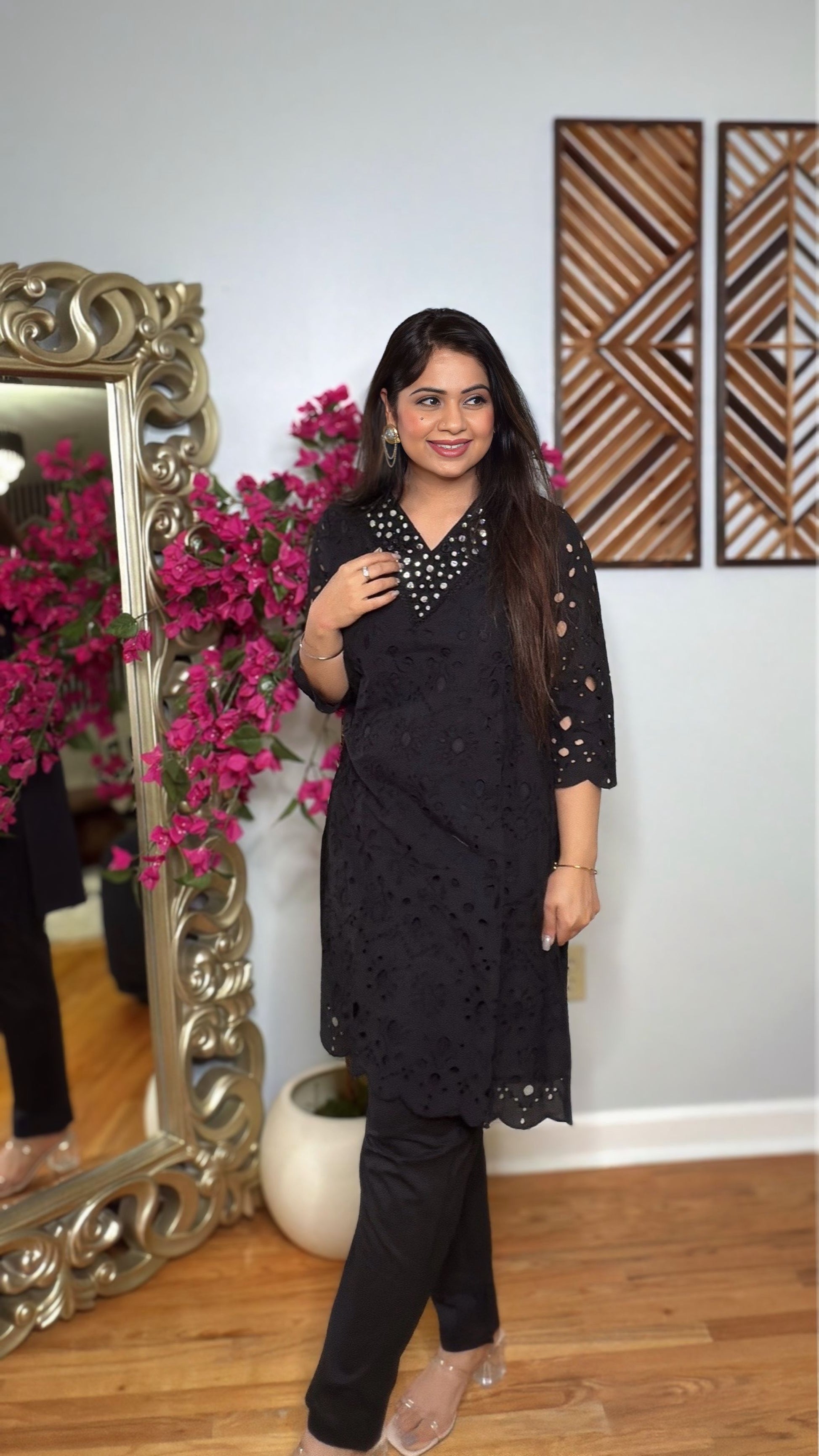 The kurta is styled with a flattering V-neckline highlighted with delicate foil mirror work, giving it a subtle festive touch without being overpowering. The relaxed silhouette ensures comfort while maintaining a polished, structured look—perfect for both casual outings and semi-formal occasions.