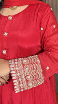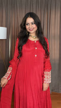 Step into timeless elegance with the Avarna Red Chinon Silk Anarkali Suit. Crafted from flowing chinon silk, this 55-inch Anarkali features exquisite handwork zardozi embroidery on the sleeves. Fully lined for comfort, it is paired with muslin silk pants and a chiffon dupatta adorned with delicate pearl embroidery, making it a refined statement for special occasions.
