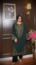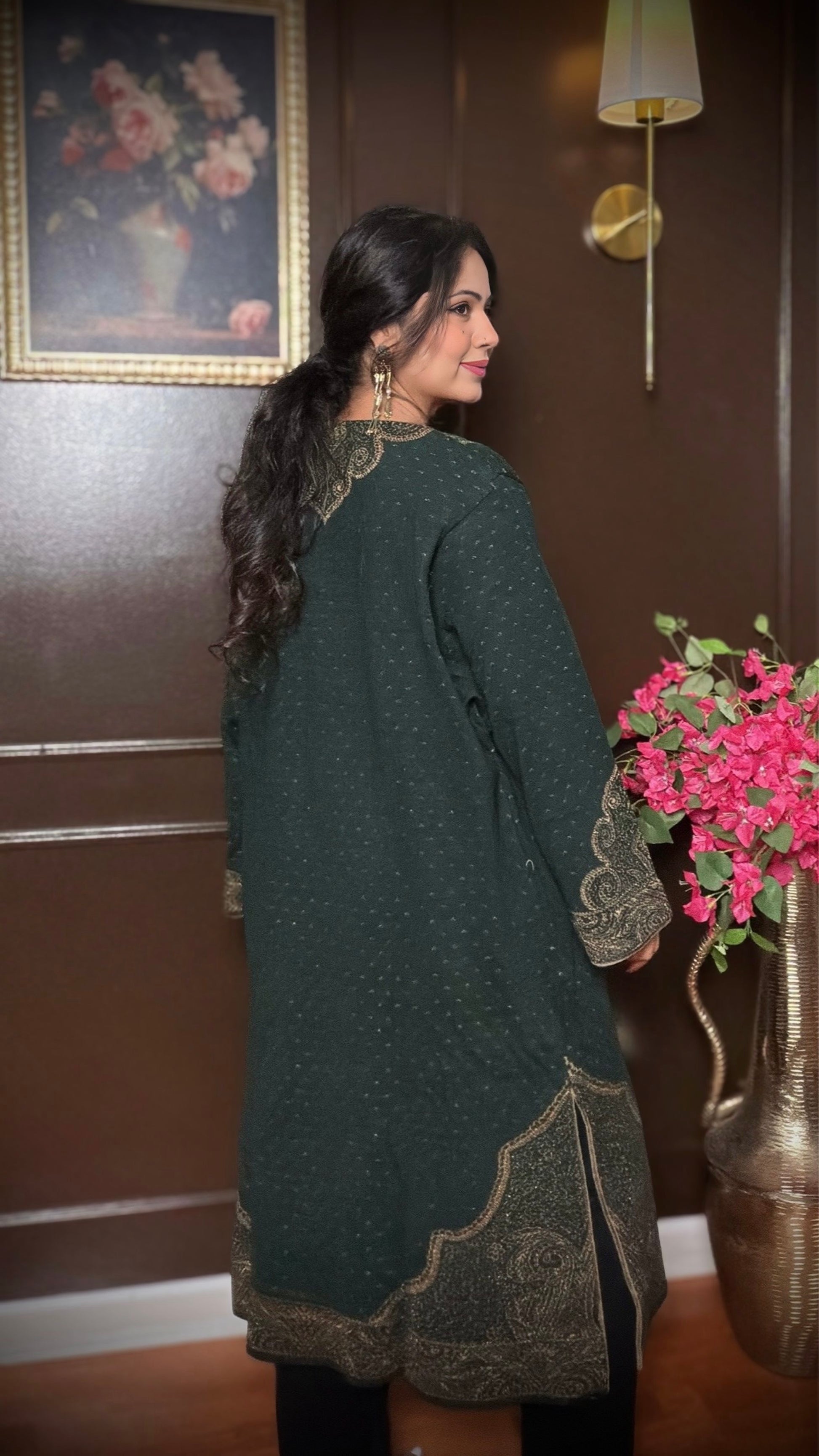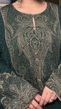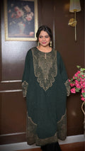 Azehra is a beautifully crafted soft woolen pheran designed for effortless winter elegance. Made with premium stretchy wool, it offers warmth without heaviness, while the intricate zari weaving adds a refined ethnic touch. The rich green tone enhances its timeless appeal, making it perfect for cozy yet graceful winter styling.