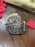 Radiate traditional charm with our Charvi Silver Floral Pearl Handcuff, an exquisite fusion of antique silver finish and intricate detailing. Handcrafted with precision, this openable cuff features engraved floral patterns, ghungroo-style beads, and dainty pearl clusters that add a touch of regal grace.