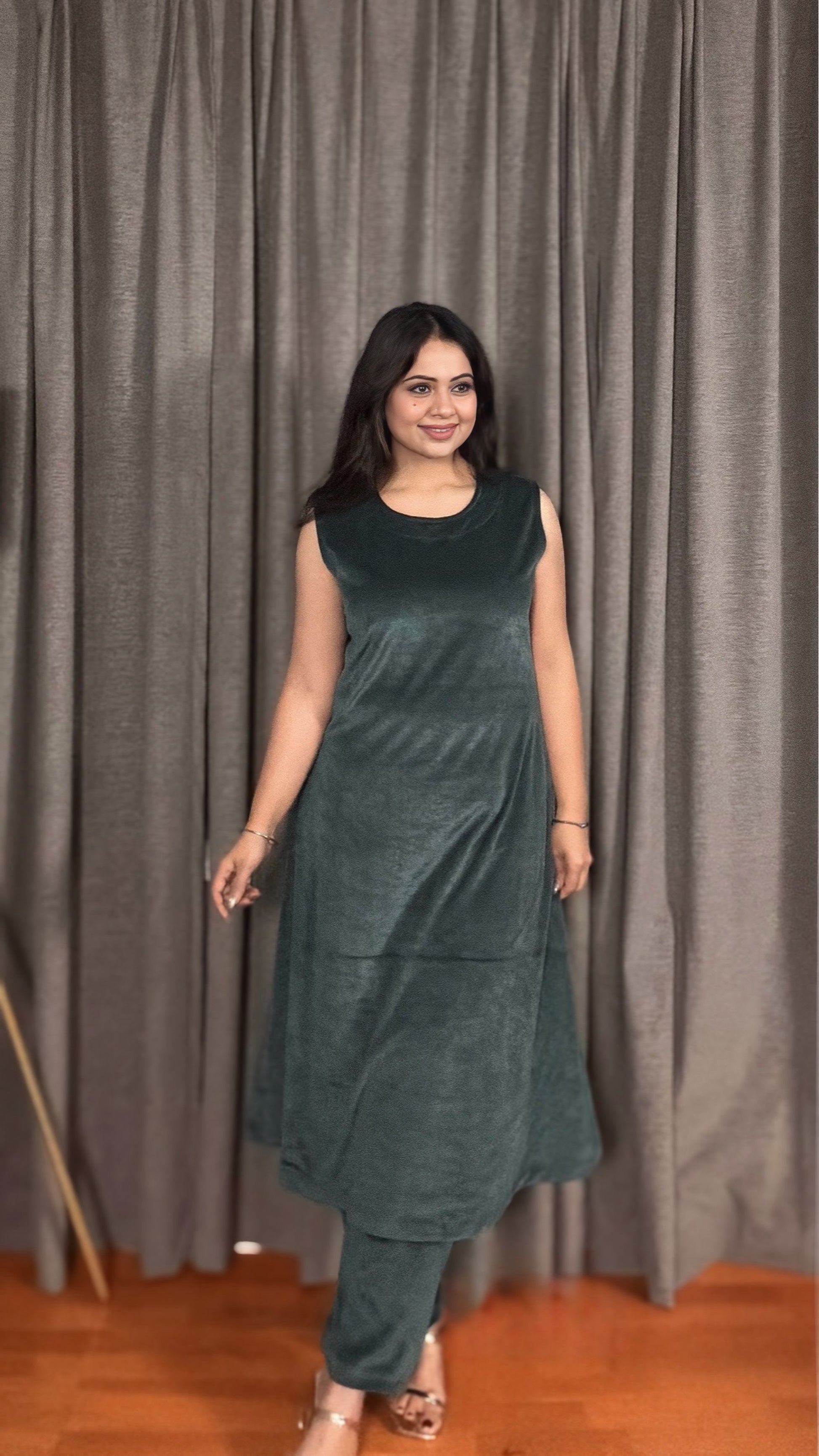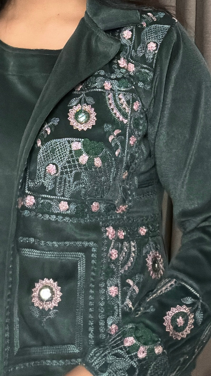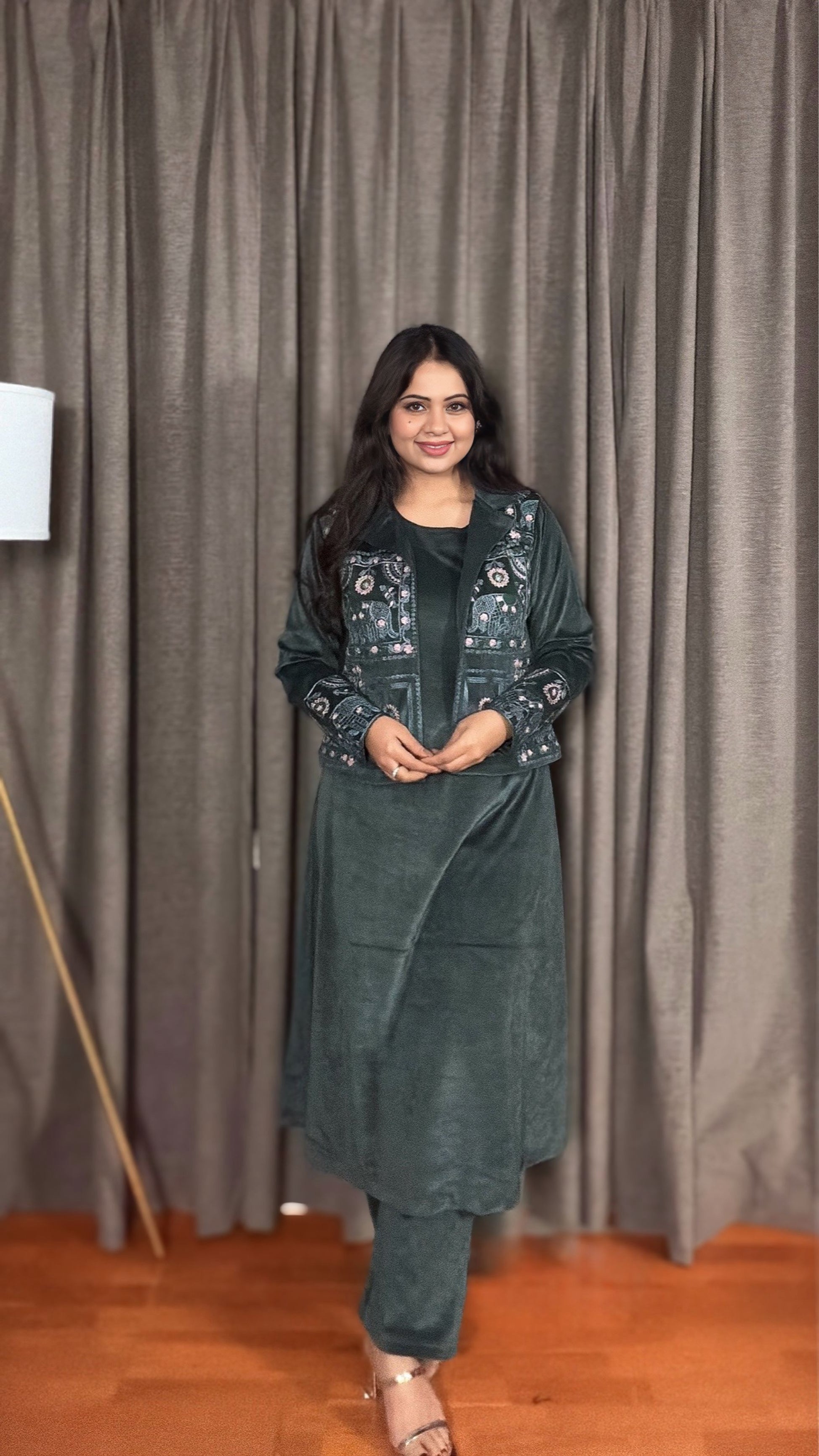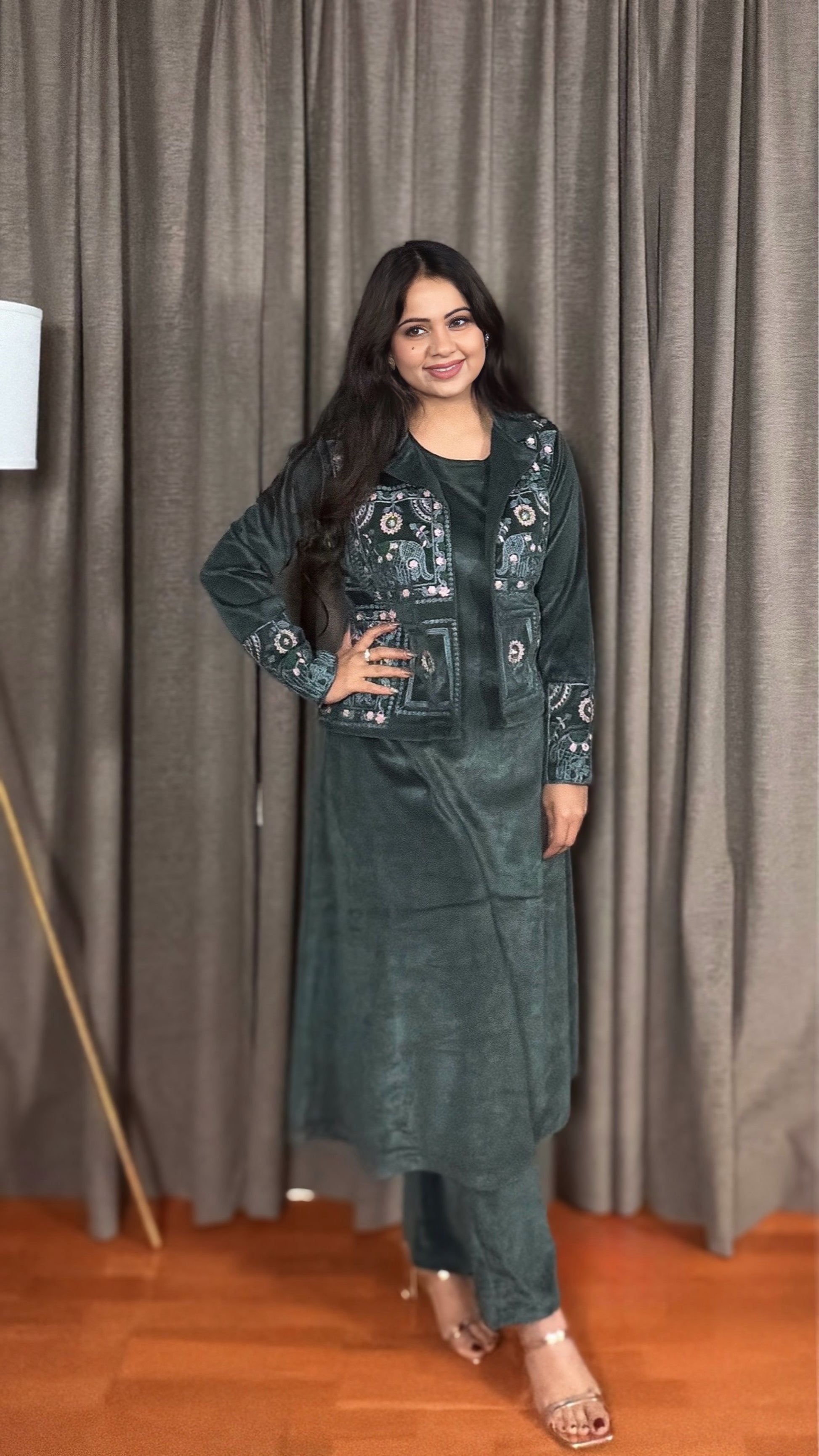 Elvari brings a modern twist to classic velvet luxury. This 3-piece set features a sleeveless long kurta and matching pants paired with an intricately embroidered velvet jacket. The deep emerald hue and soft velvet texture make it a statement outfit for winter soirées, festive gatherings, or elegant evening wear.