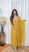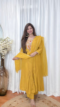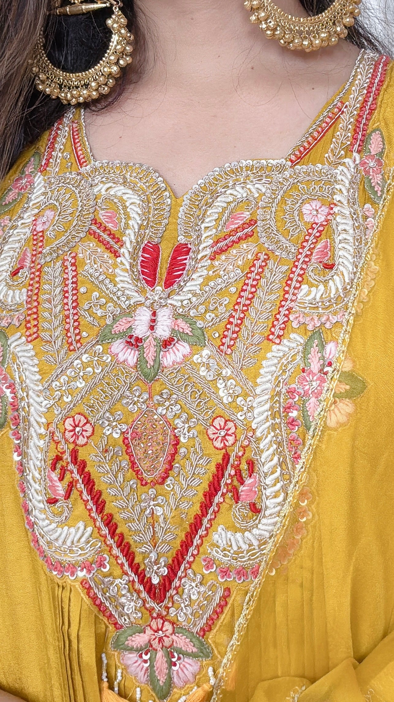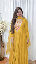 Step into regal elegance with the Golden Glow Zardozi Anarkali Set. This stunning Anarkali is adorned with intricate Zardozi embroidery, giving it a luxurious shimmer that’s perfect for festive occasions, weddings, or evening celebrations. The warm golden hue adds a majestic touch, making you the center of attention wherever you go.