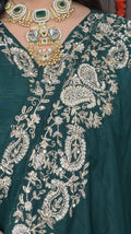 Ethereal elegance unfolds with Inaya, a regal emerald green Dola silk Angrakha-style Anarkali set that radiates timeless sophistication. Crafted in soft, luxurious Dola silk, the Anarkali features intricate handwork detailing that enhances its traditional silhouette with artisanal finesse.