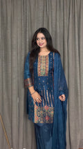 Effortless elegance meets contemporary charm with Ira, a stunning blue jacquard woven short kurta set. The kurta features a chic, short-length silhouette, perfectly paired with soft muslin pants and a flowing chiffon dupatta for an ethereal finish.