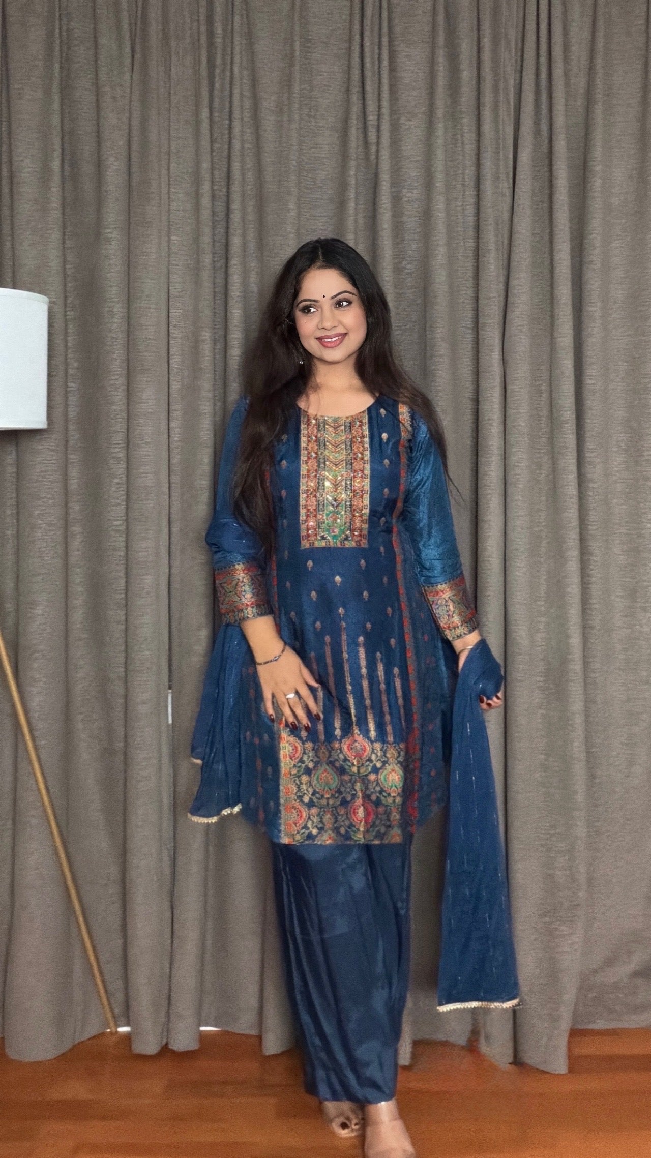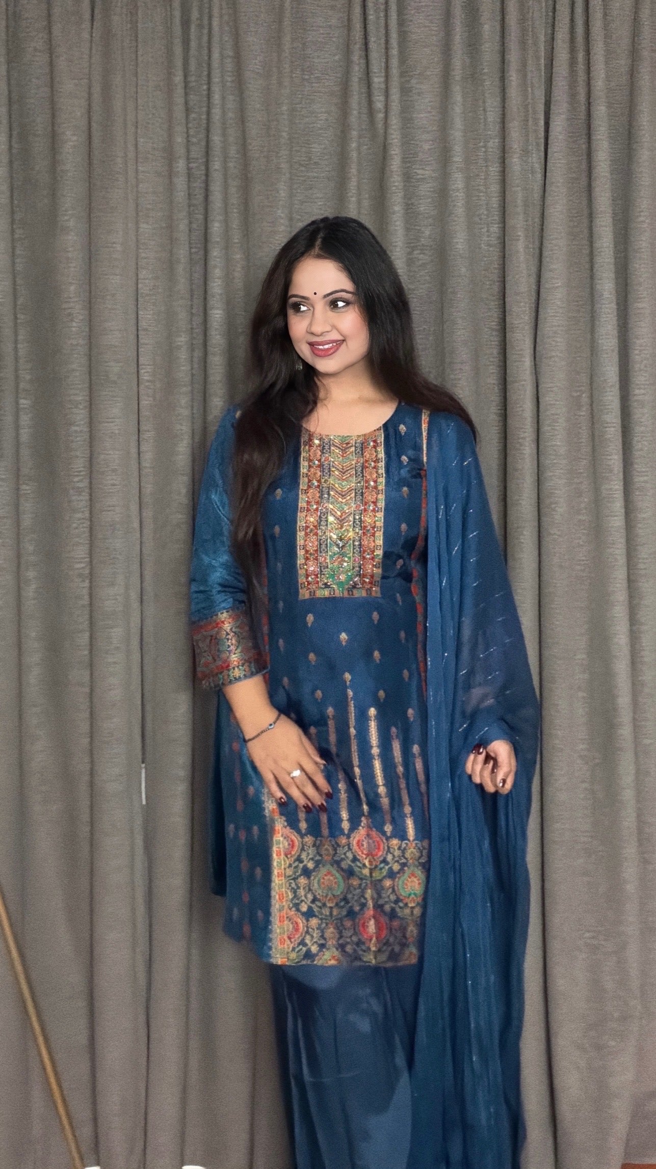 - Fabric: Meenakari Jacquard Kurta | Muslin Pants | Chiffon Dupatta