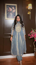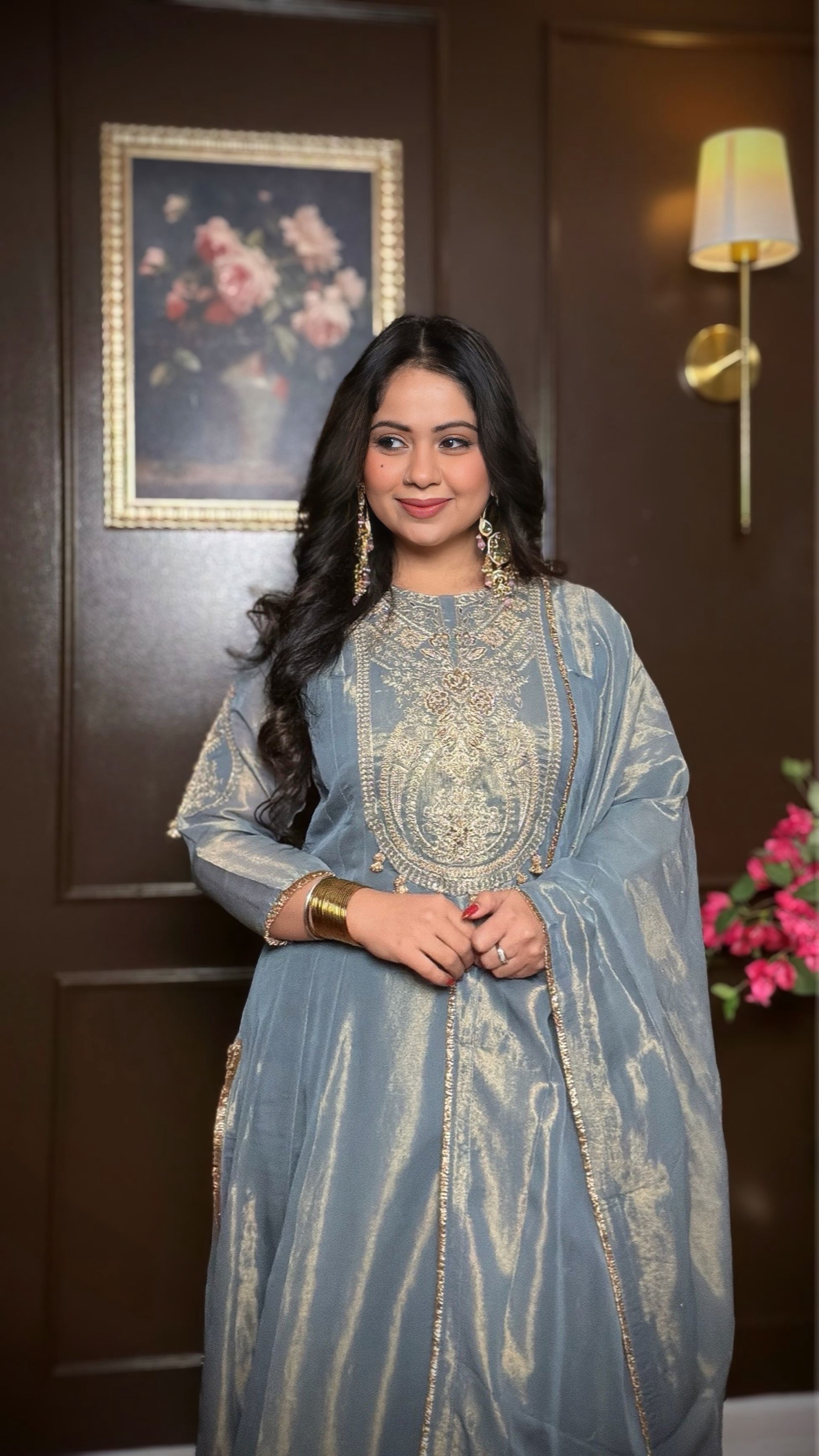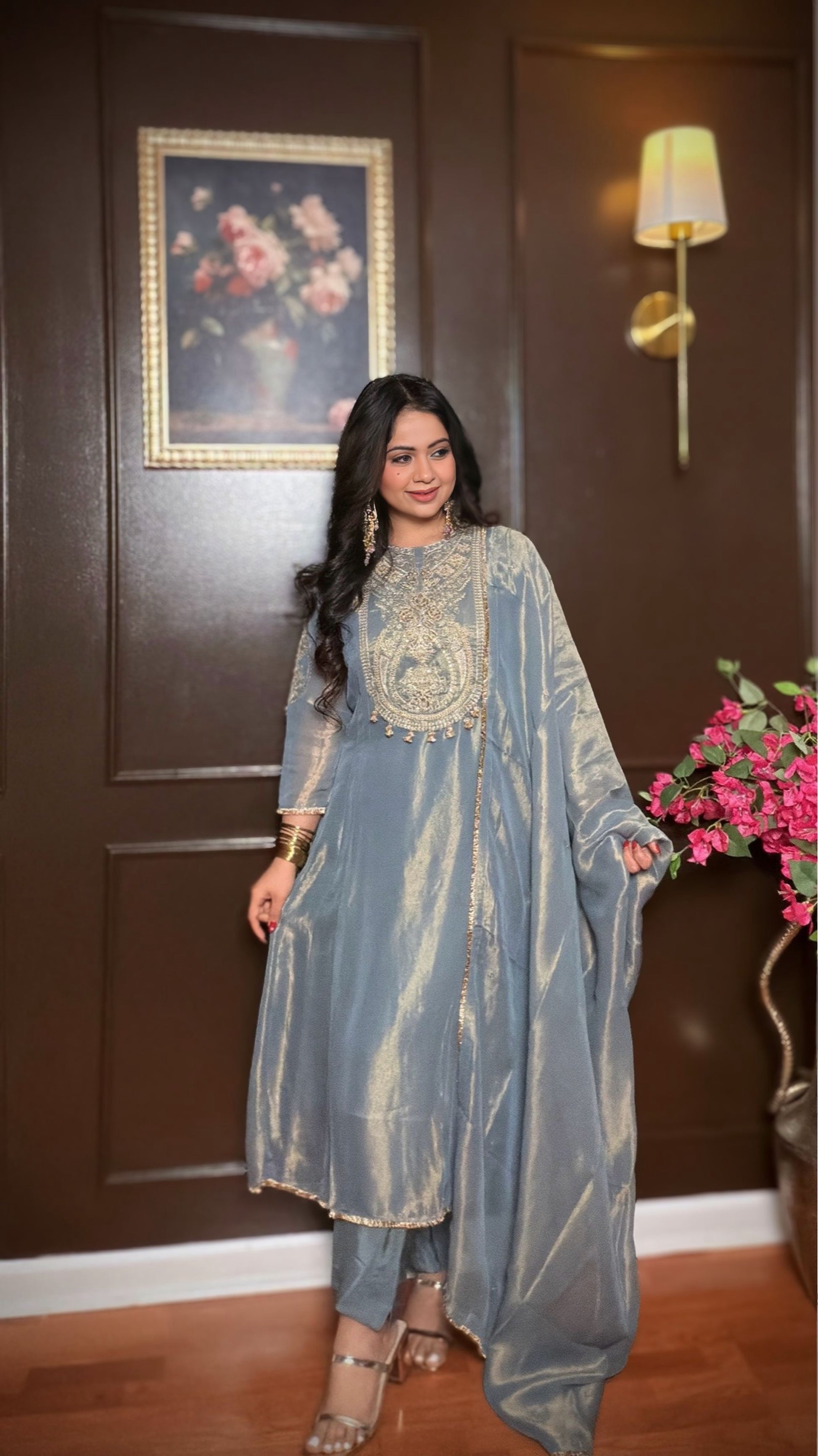 Ireya is a graceful festive ensemble crafted in luminous tissue shimmer fabric, designed for understated luxury and elegance. The kurta features intricate zari and hand embroidery that adds a rich focal detail, while the soft shimmer fabric flows beautifully with every movement. Paired with coordinated pants and a matching tissue dupatta, this set is ideal for refined festive and evening occasions.