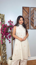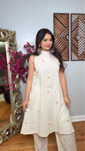 A graceful ivory linen cotton kurta set designed for effortless summer elegance. The sleeveless high-neck kurta features delicate floral embroidery scattered across the fabric, creating a minimal yet sophisticated look. Paired with comfortable straight pants, this breathable outfit is perfect for summer gatherings, casual festive moments, or elegant day wear.