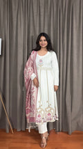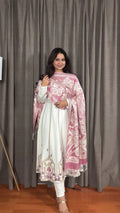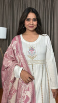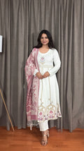 Soft, graceful, and effortlessly elegant — Ivraani brings winter charm with a knitted woolen base paired with a jacquard shawl. The Anarkali-inspired silhouette, delicate thread embroidery, and soothing ivory tone make it the perfect blend of warmth and sophistication. A must-have for festive evenings or cozy winter gatherings.