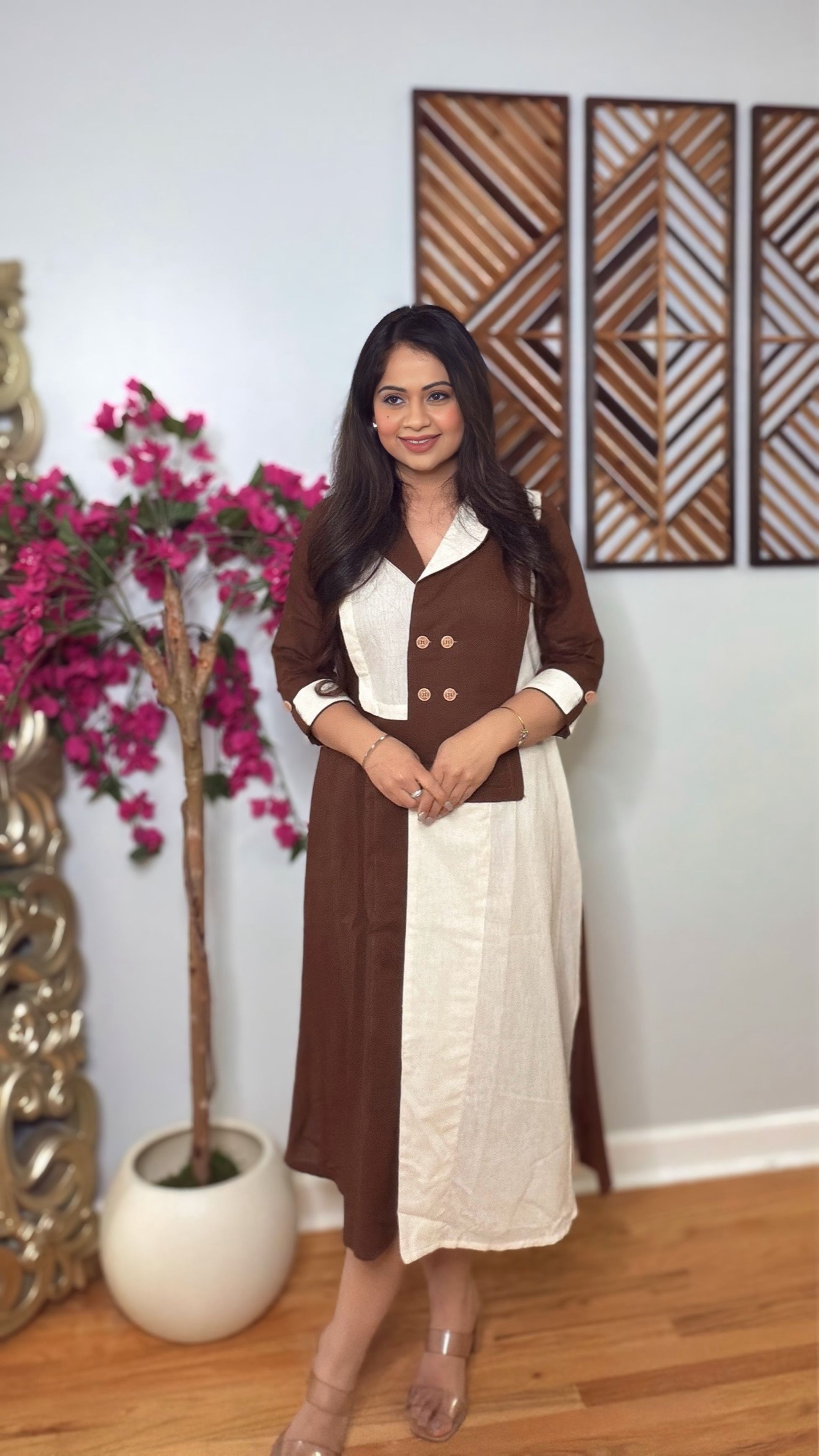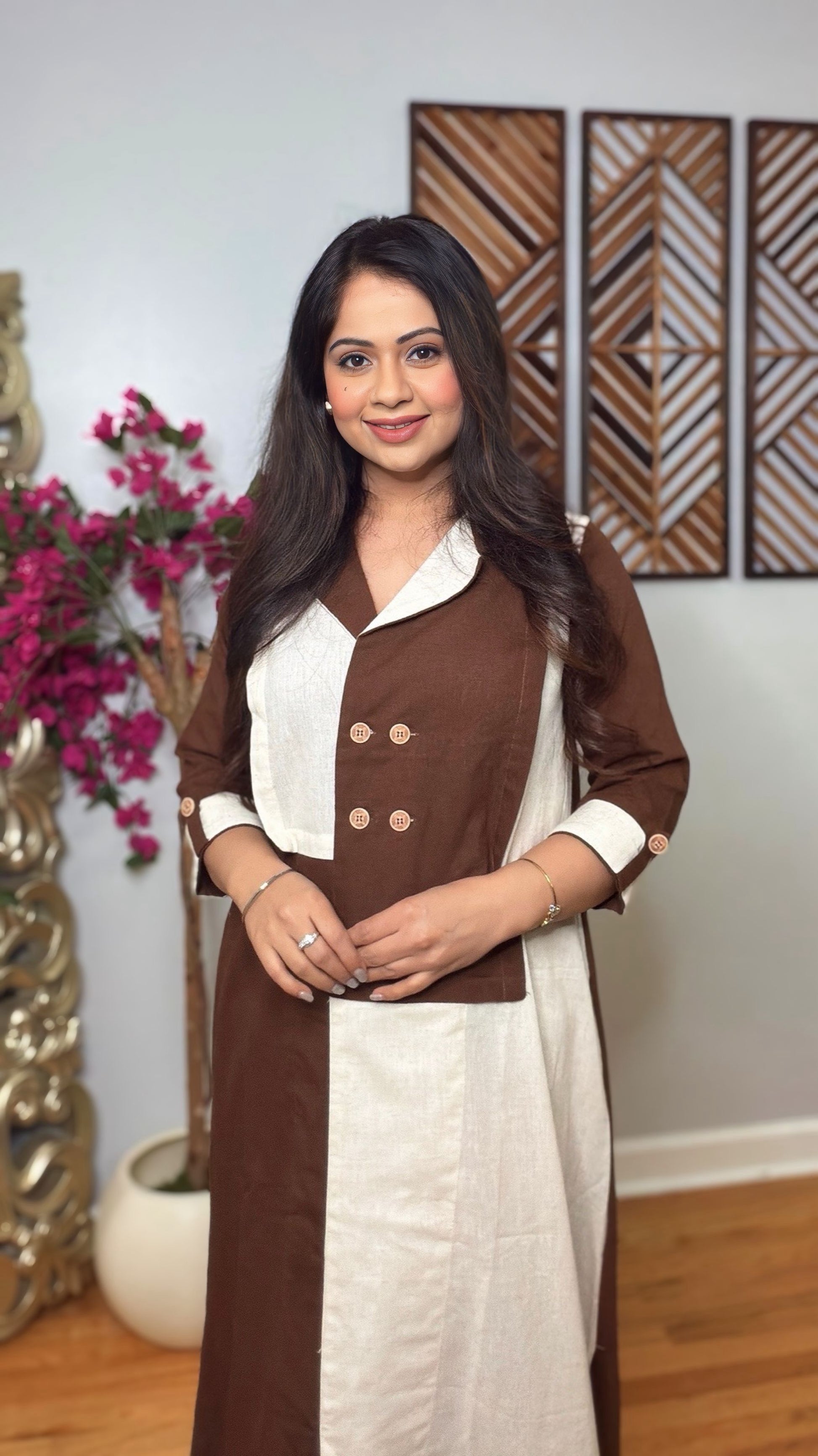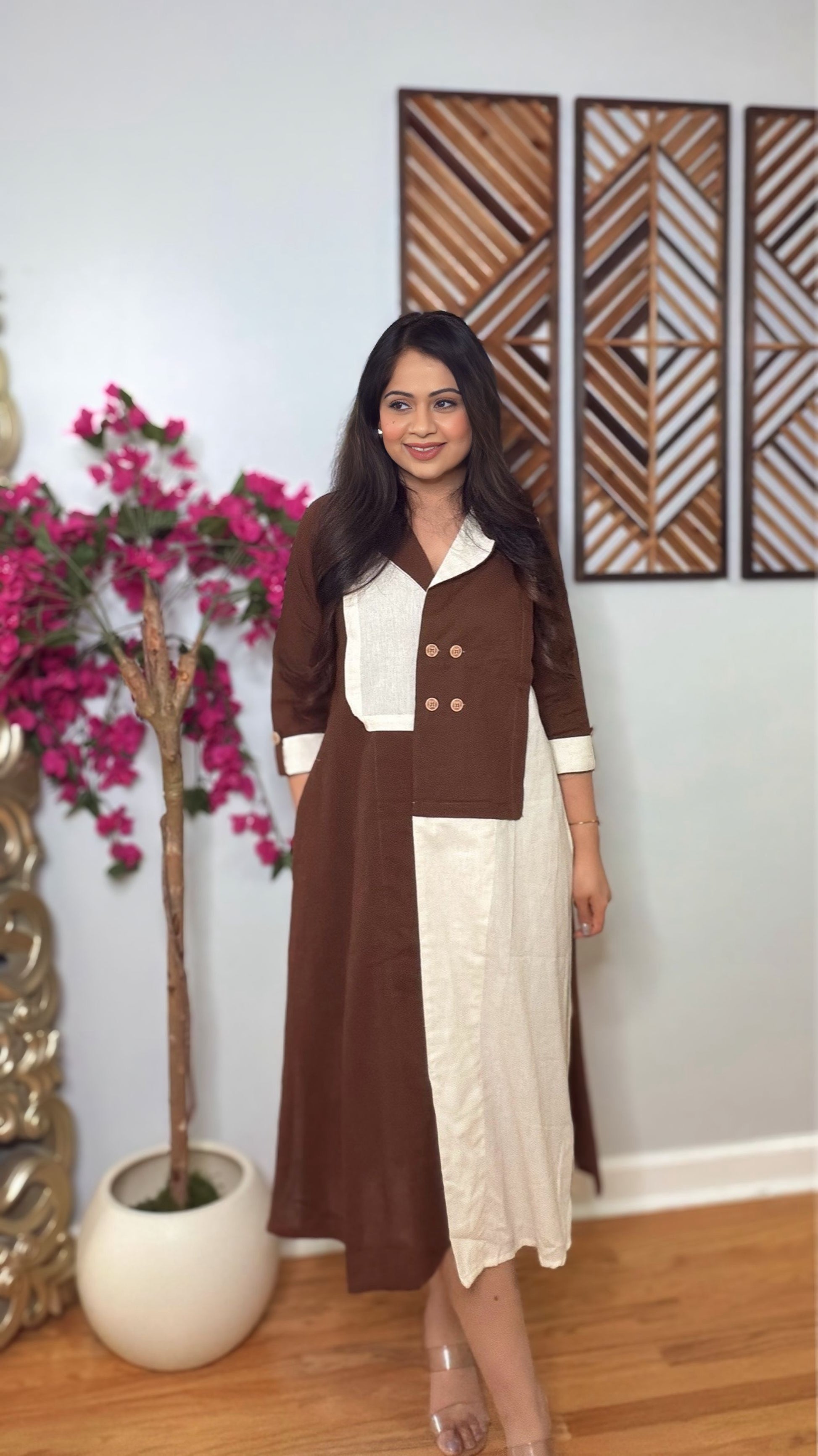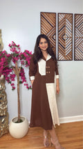 Elevate your everyday style with the Kaeryn Dual-Tone Linen Midi Dress, a modern blend of minimal elegance and effortless comfort. Crafted in breathable premium linen fabric, this outfit features a sophisticated brown and ivory color-block design that creates a sleek and contemporary look.