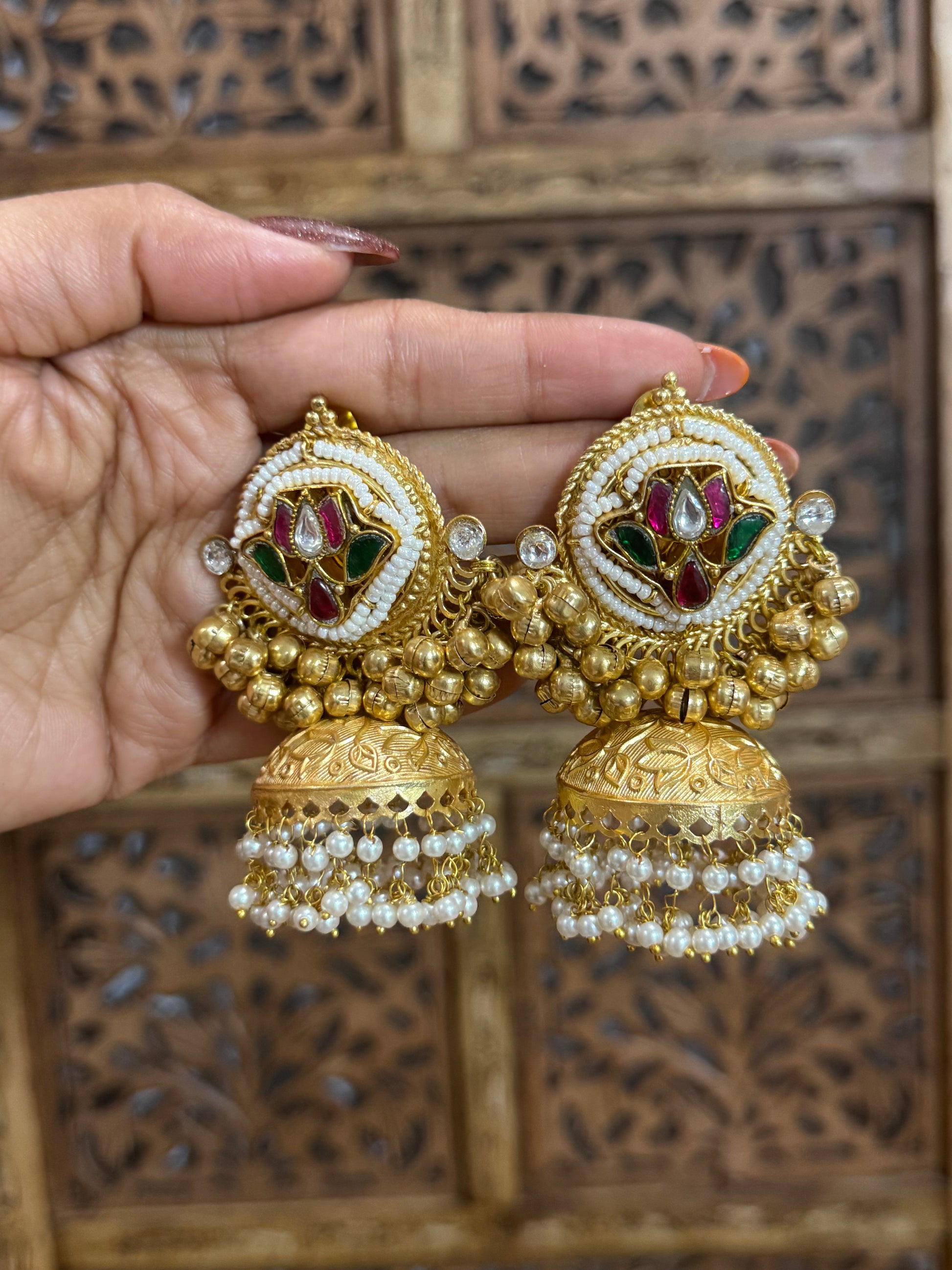 - Dome-shaped jhumka with double pearl edging