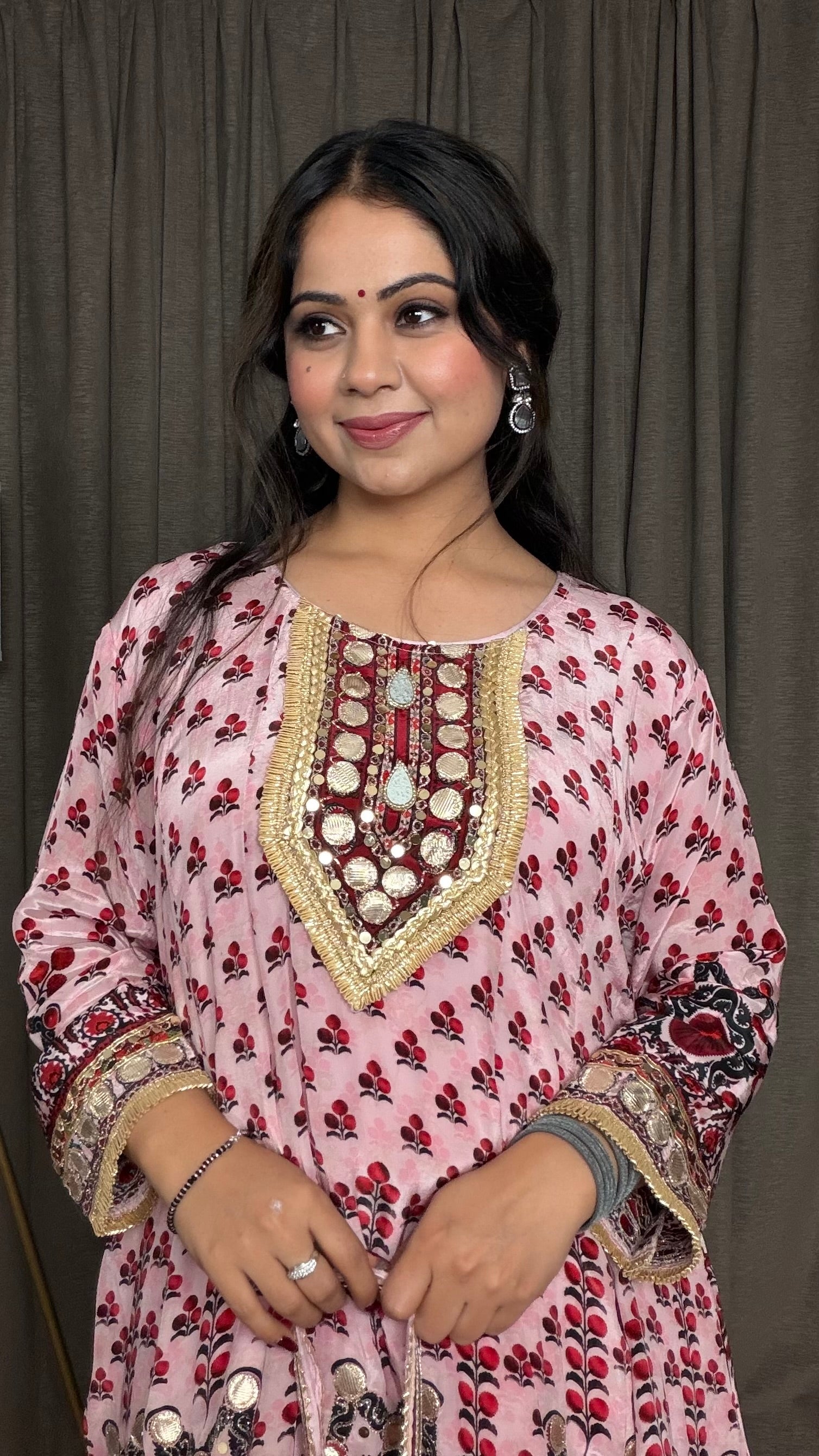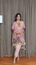 Playful yet poised, Naira captures the spirit of modern elegance in a pink digital-printed crepe co-ord set. The ensemble features a chic short peplum top with Gotta Patti embroidery, paired with trendy dhoti-style pants that bring comfort and flair together.