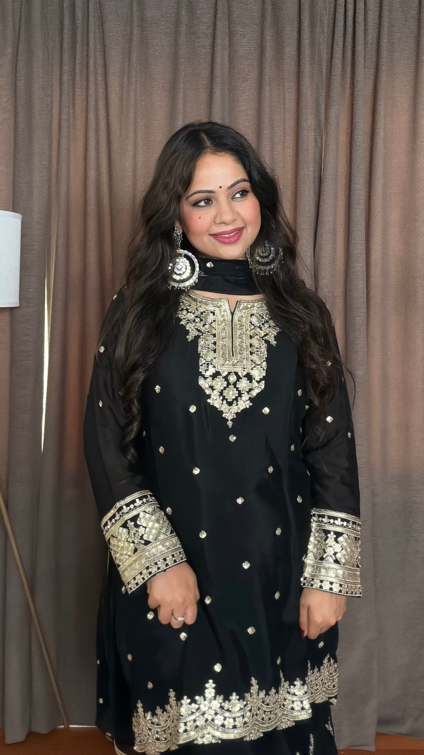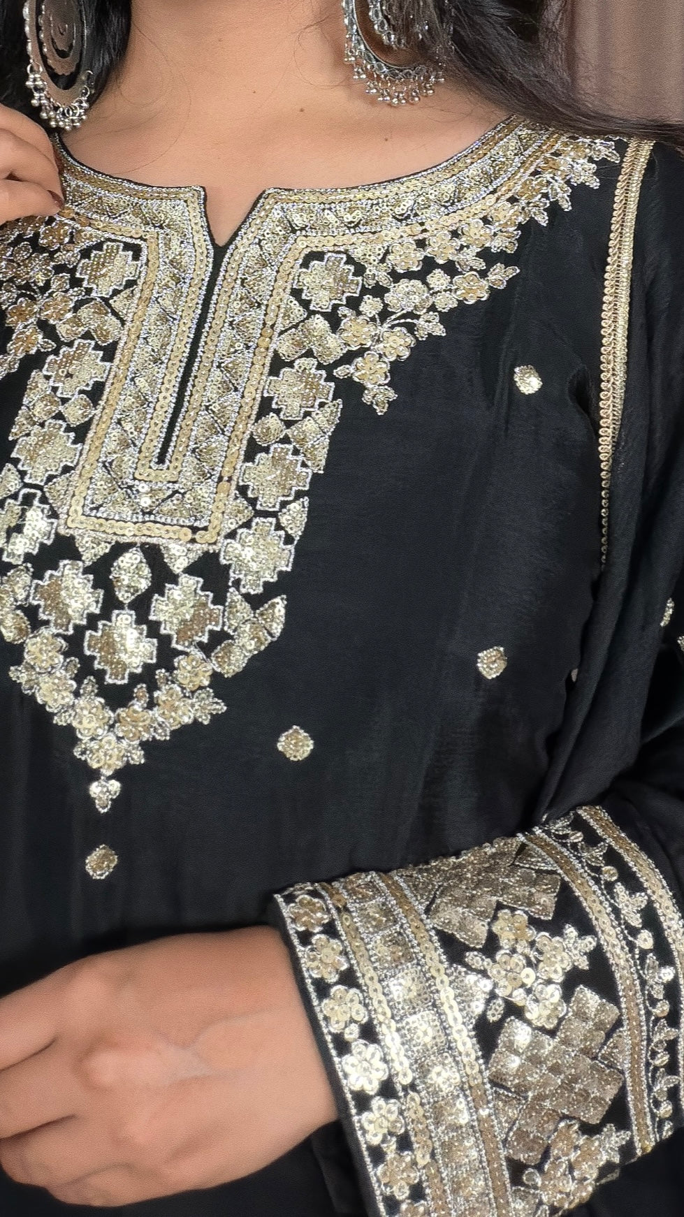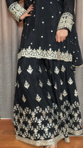 Make a statement in the Nayira Gharara Suit, crafted in luxurious chinon silk. The short-length shirt features elegant zari and sequins embroidery, perfectly paired with a flowing gharara bottom. A lightweight chiffon dupatta completes the look, adding sheer grace to this timeless silhouette.