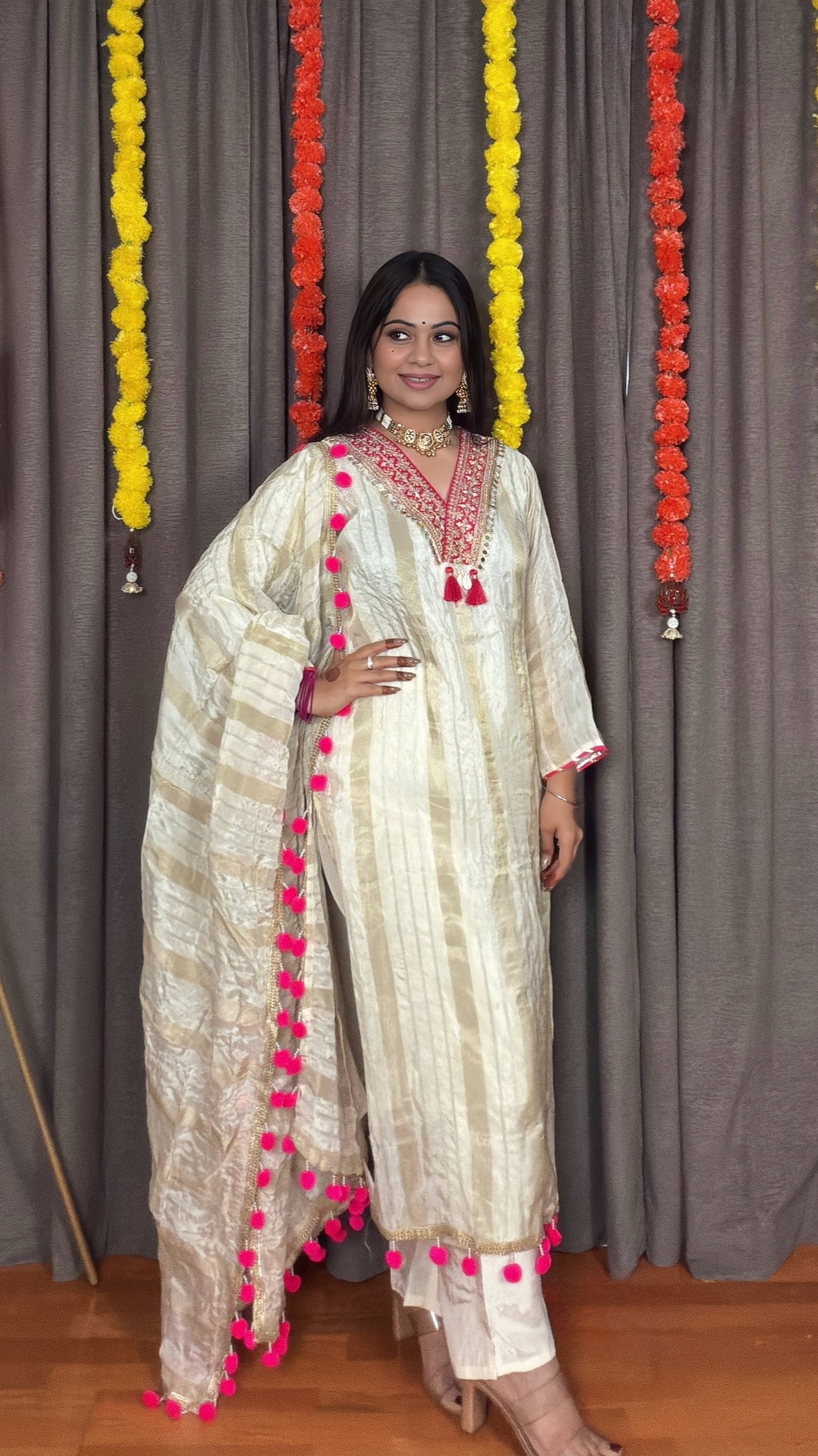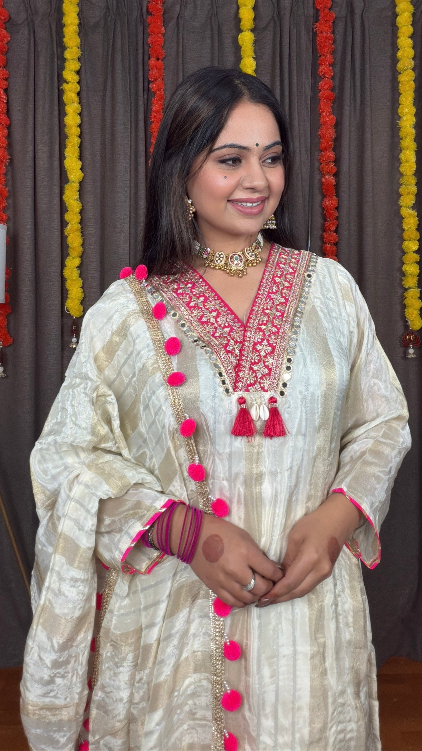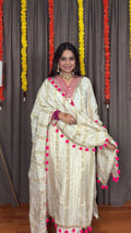 Subtle, serene, and sophisticated — Noor captures the essence of understated luxury in this exquisite ivory Tissue Banarasi suit set. The kurta features delicate mirror detailing and playful pink pom-poms, creating the perfect balance of elegance and charm.