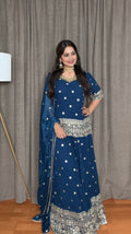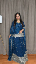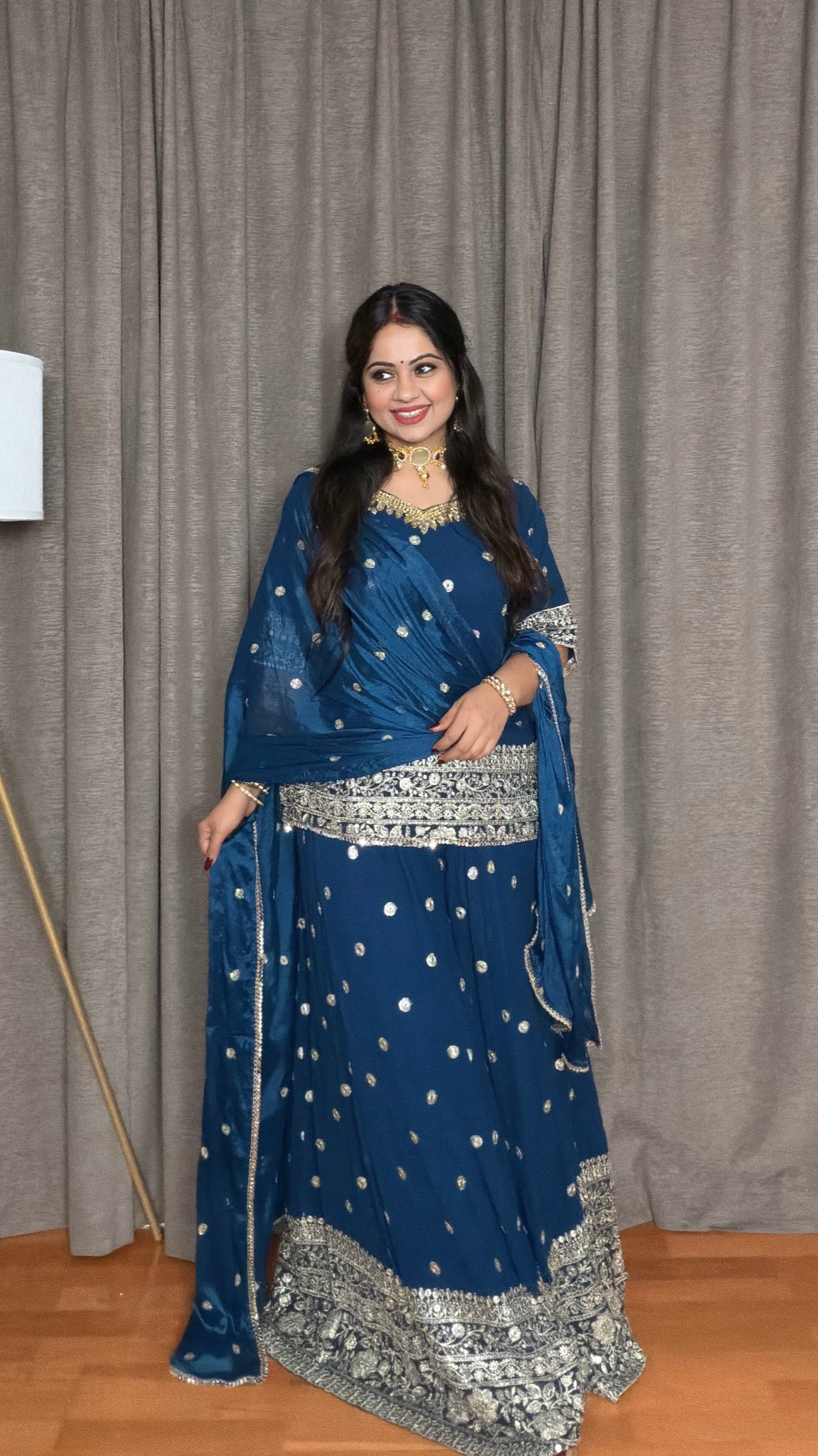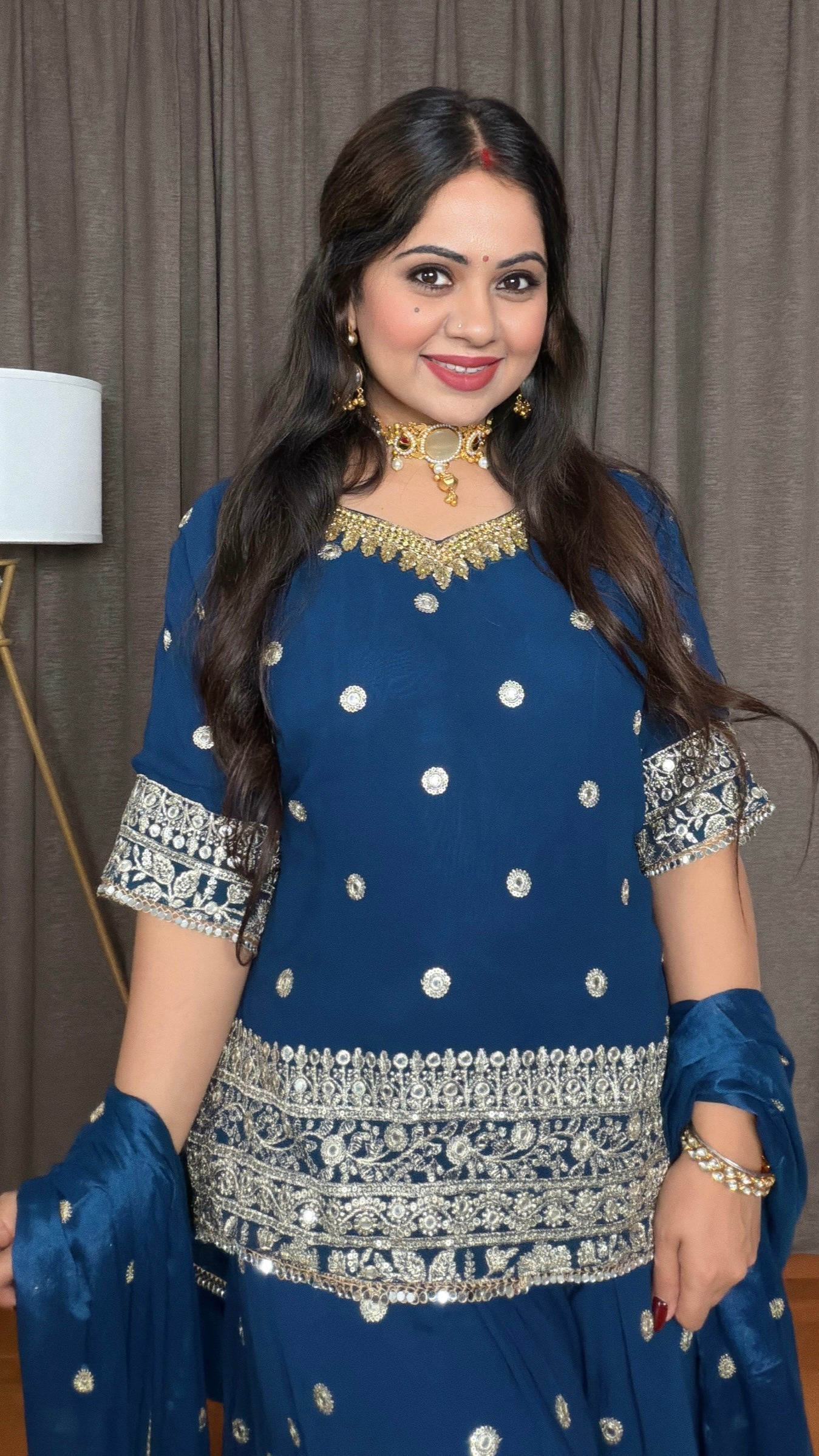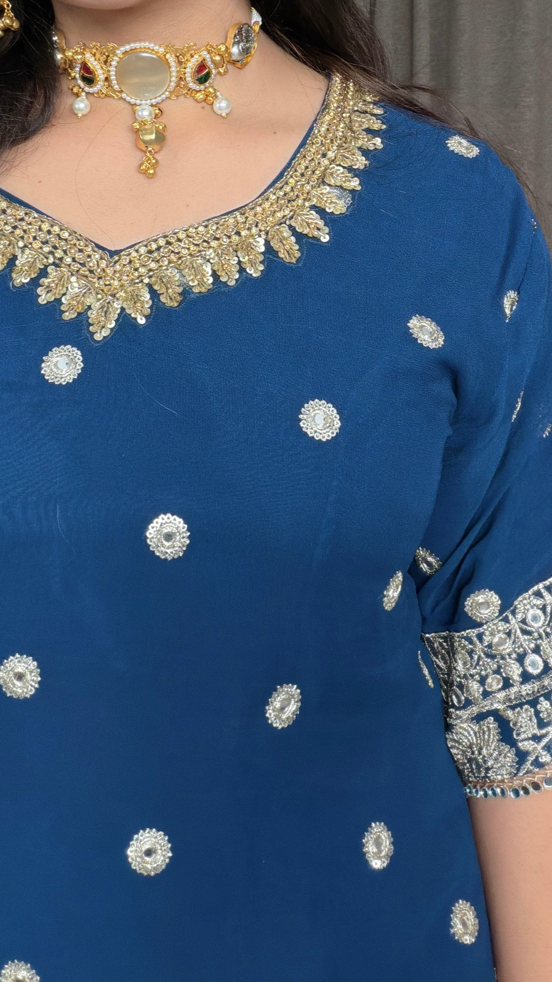 Step into effortless elegance with the Noorika Blue Georgette Tunic Set. This chic short tunic, measuring 25 inches in length, features exquisite zari and sequins embroidery on both front and back. Paired with flowy palazzo pants and a soft Chinon dupatta, this ensemble strikes the perfect balance between traditional and contemporary style — ideal for festive gatherings and semi-formal occasions.