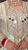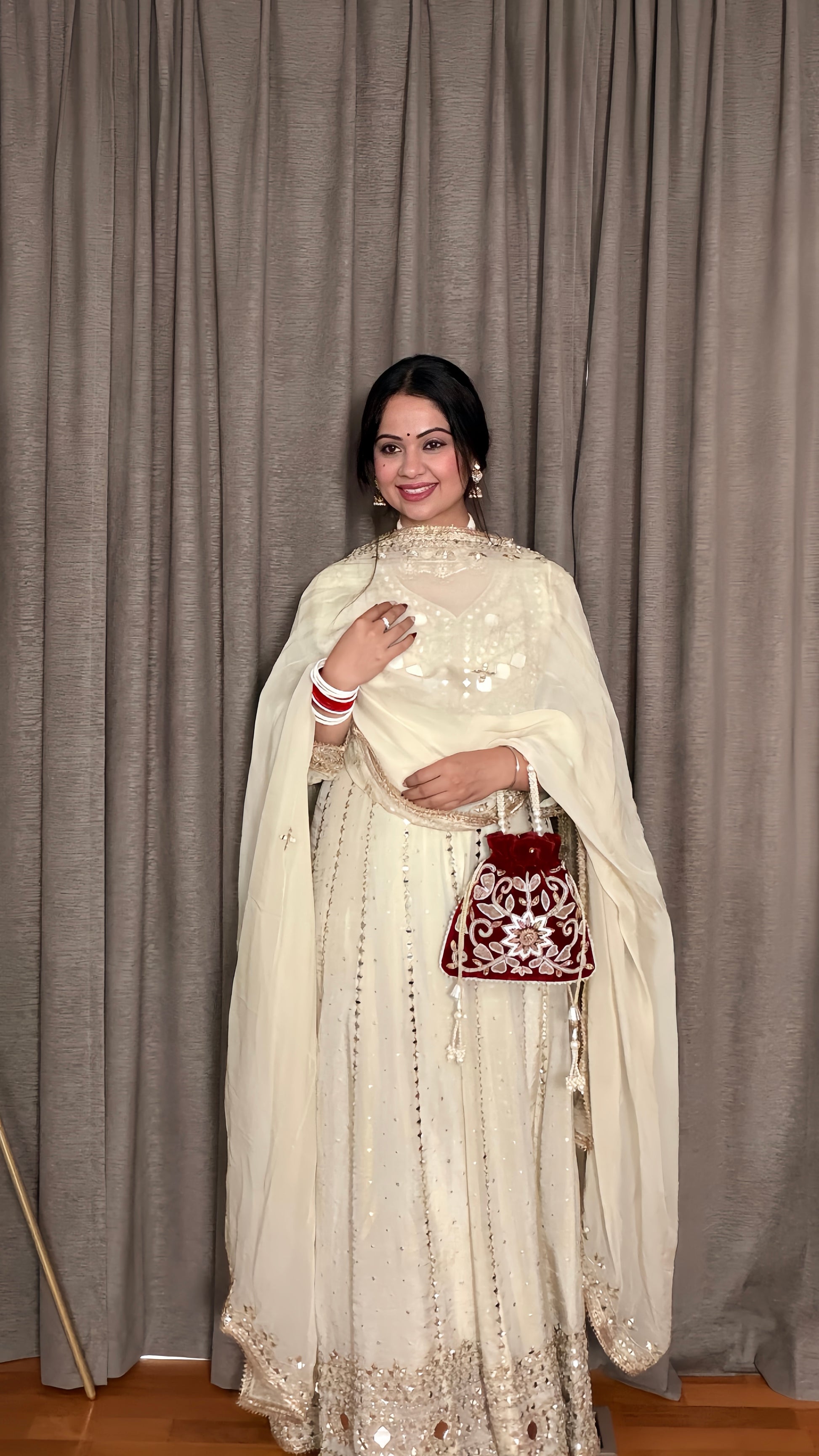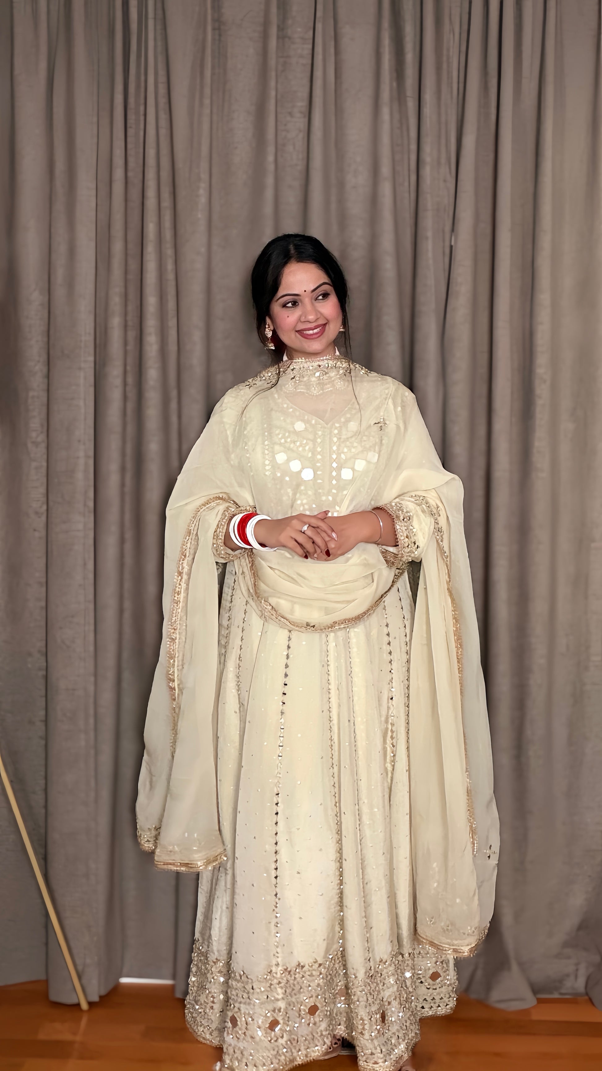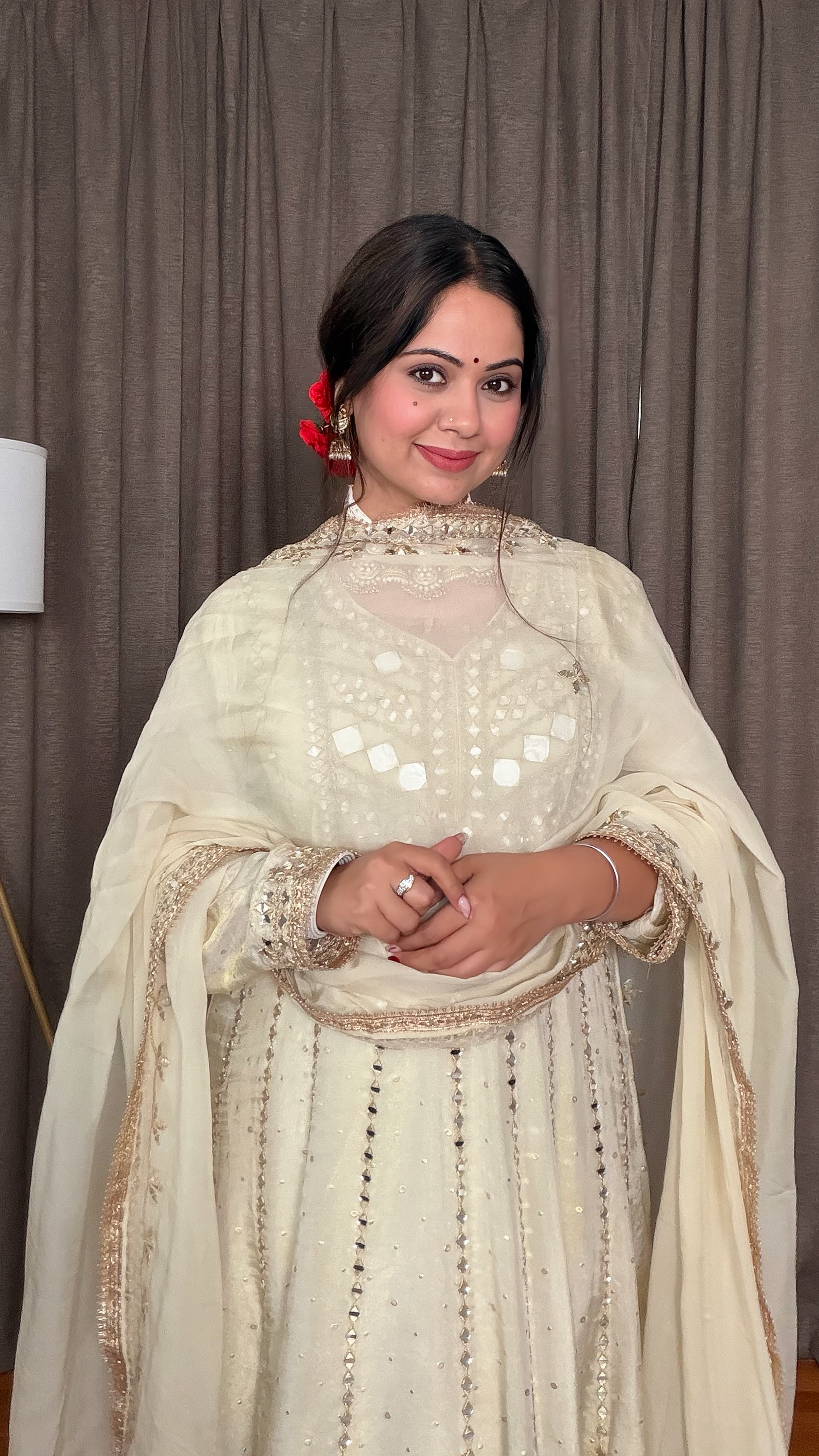 Step into radiance with our Ivory Real Mirror Anarkali Gown. Crafted in a graceful silhouette, this full-length Anarkali features hand-done real mirror and zari detailing that adds a regal shimmer. Designed with soft organza dupatta adorned with mirror accents and fully lined with luxurious santoon fabric, it ensures both comfort and elegance. The 56-inch length gives a flowing, timeless drape, making it an exquisite choice for festive evenings and weddings.