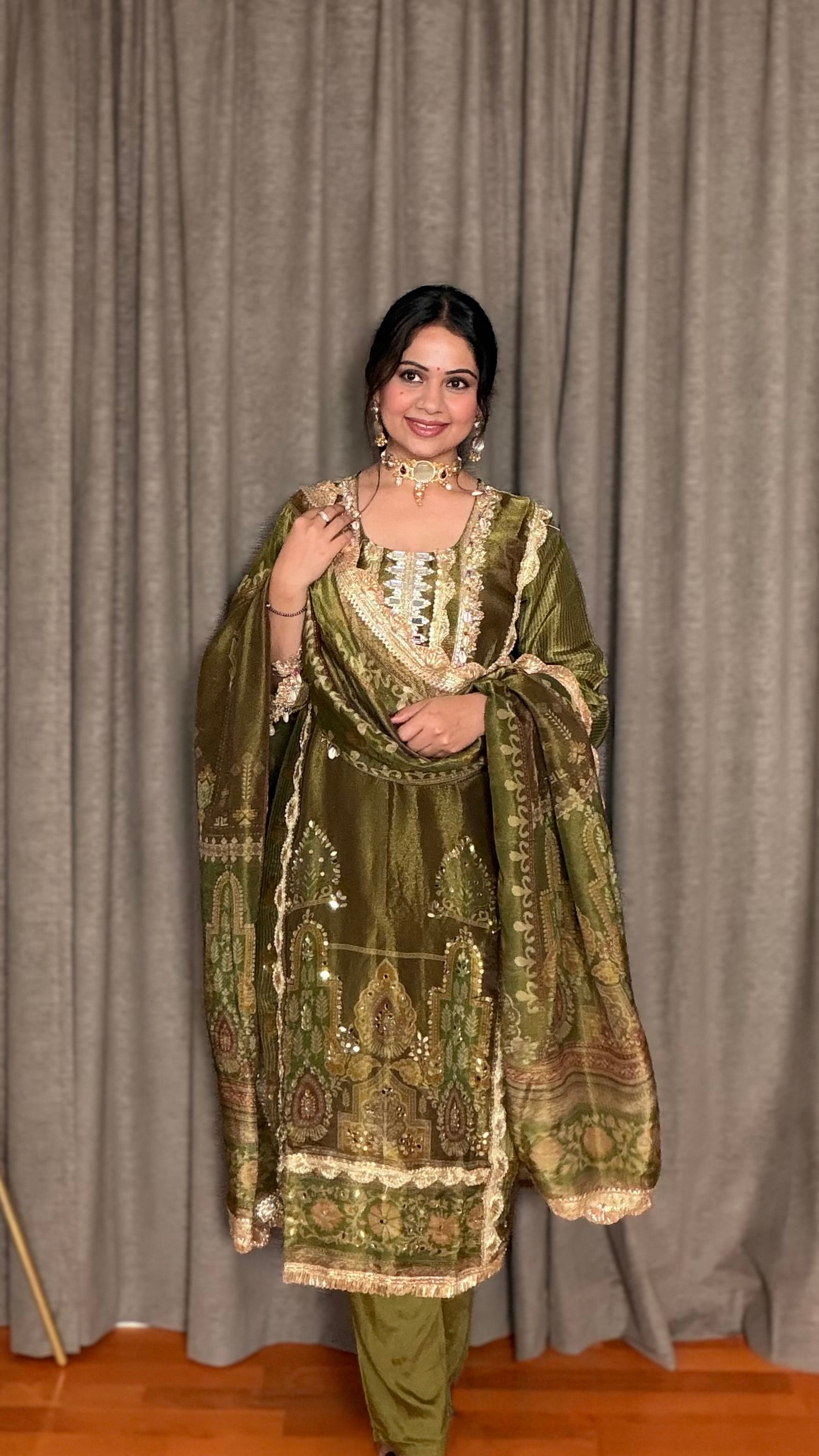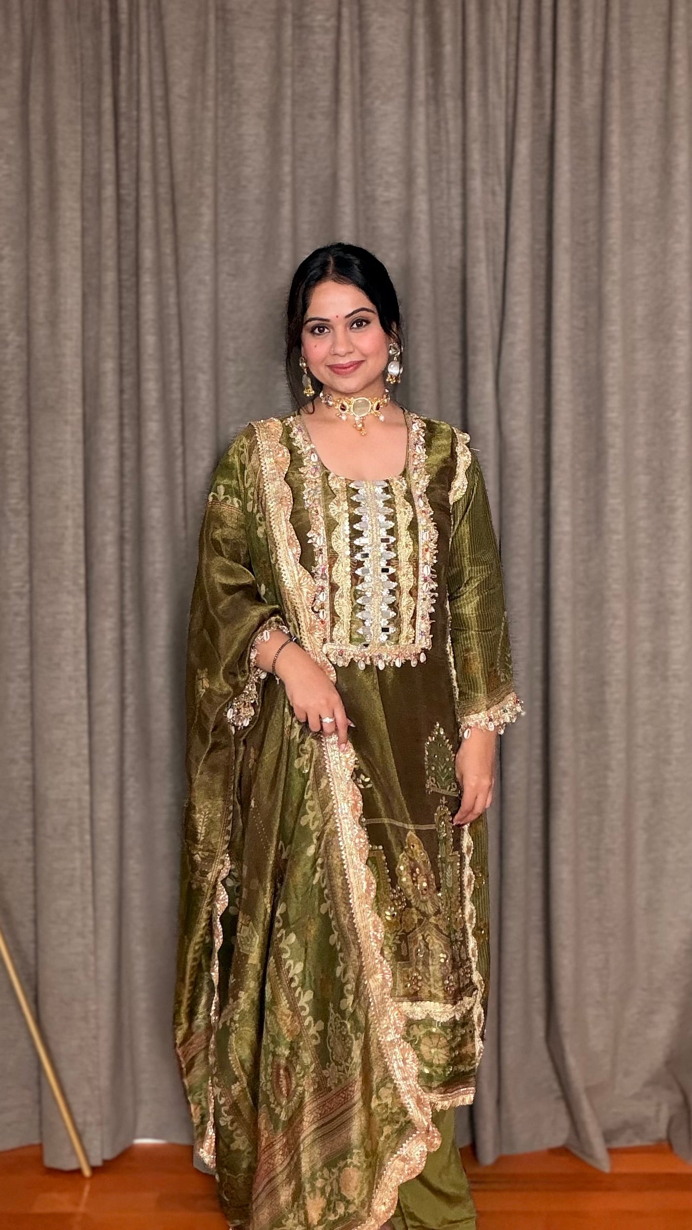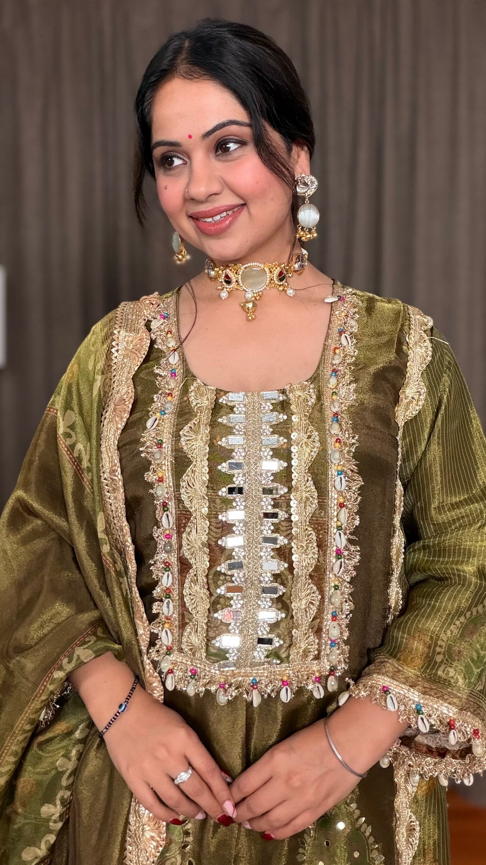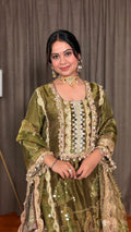Step into elegance with the Olive Radiance Straight Suit. Crafted from tissue shimmer fabric, this straight-fit ensemble showcases exquisite digital prints, real mirror embroidery, and delicate shell detailing. The olive green shade is perfectly highlighted with a shimmering gota border, making it a standout piece for festive occasions.
