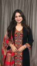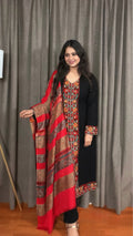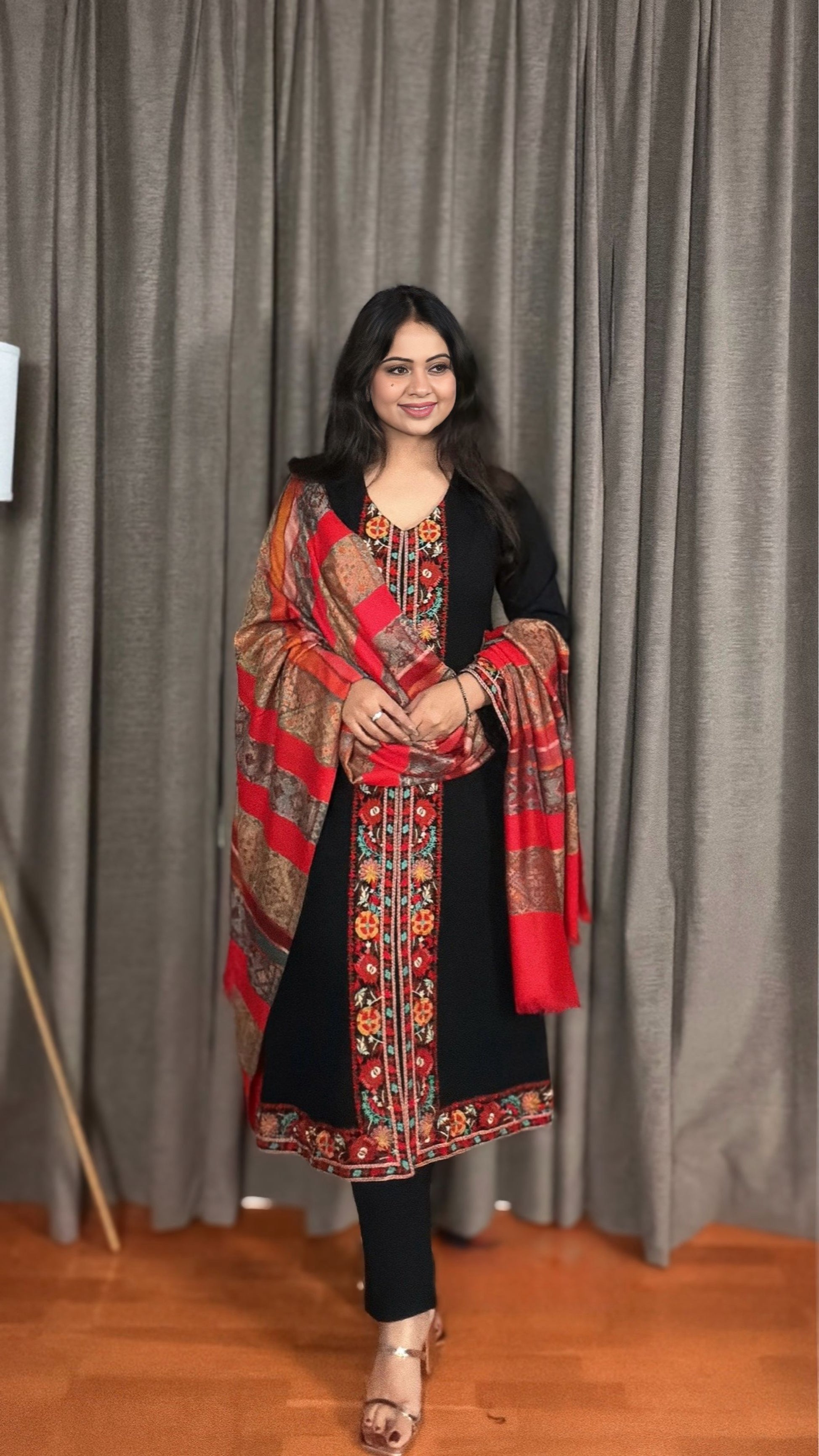 Raahira embodies timeless Kashmiri charm with a touch of modern elegance. Crafted from warm knitted wool, this black suit features exquisite multicolor embroidery along the neckline and sleeves. Paired with a vibrant red woven shawl, it’s perfect for winter festivities, cozy gatherings, and elegant evenings where comfort meets tradition.