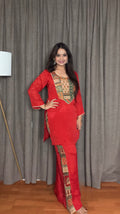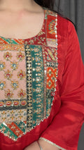 Modern elegance meets traditional artistry in Reha, a vibrant rust orange Chinon silk co-ord set designed for effortless sophistication. Crafted in soft, flowy Chinon silk, this ensemble features multi-color digital prints and exquisite zari-sequins embroidery that add a luminous touch to every detail.