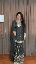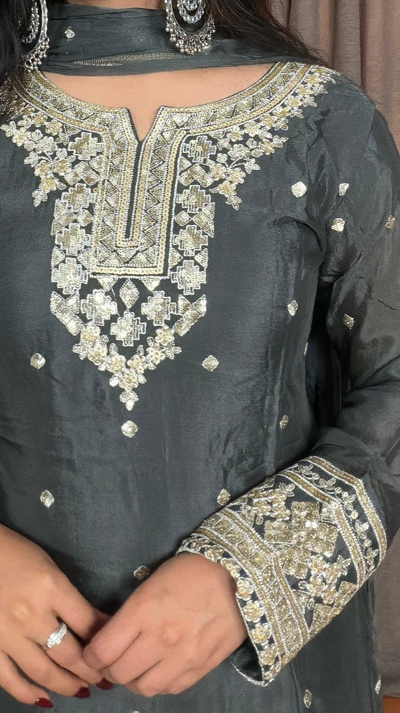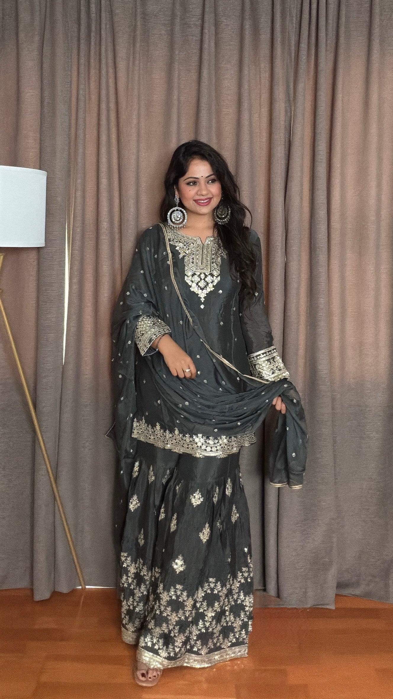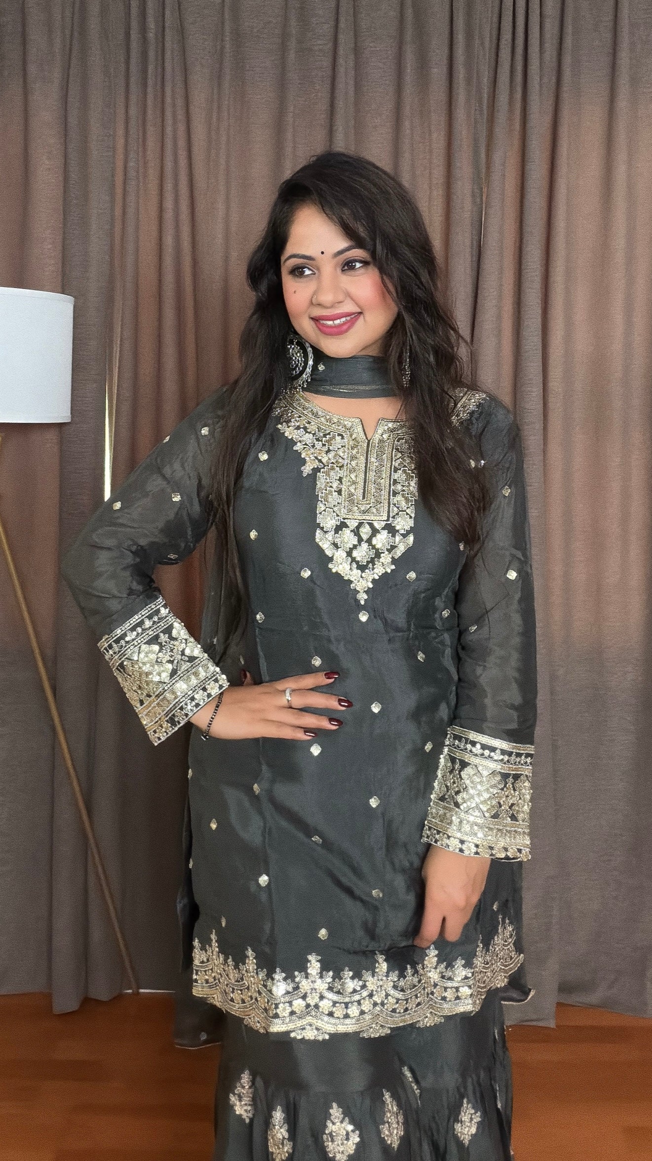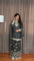 Grace meets elegance in the Reyna Gharara Suit, crafted in luxurious chinon silk. The short-length shirt features intricate zari and sequins embroidery, beautifully paired with a flowing gharara bottom. A soft chiffon dupatta completes the ensemble, adding a refined touch to this sophisticated silhouette.