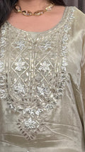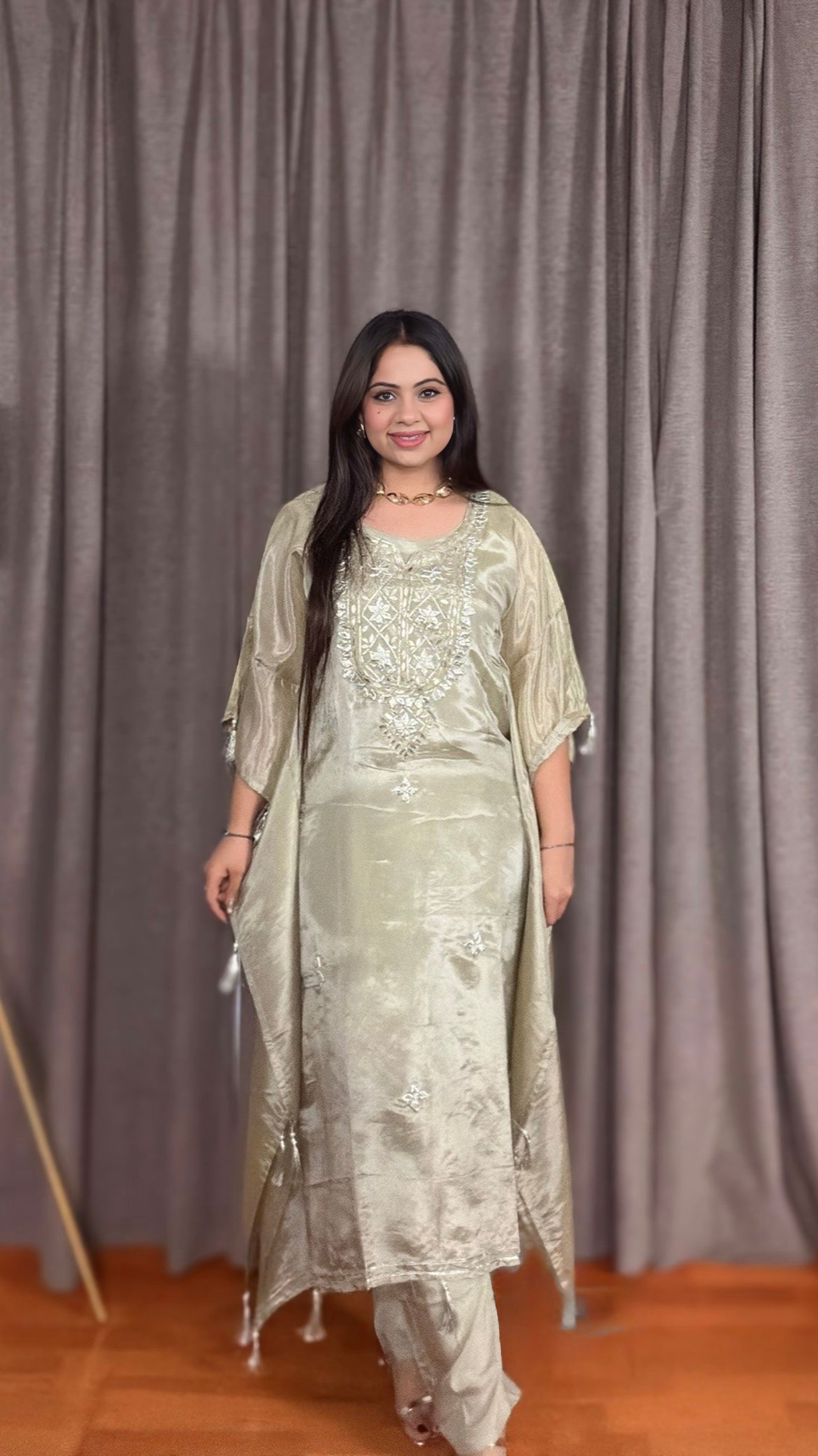 Rishani glows with understated luxury — crafted in tissue silk for a graceful shimmer. The subtle beige-golden hue, paired with hand-embroidered detailing on the neckline and sleeves, creates a look that’s effortlessly regal. Designed with a soft flow and chic silhouette, it’s perfect for festive evenings and elegant gatherings.