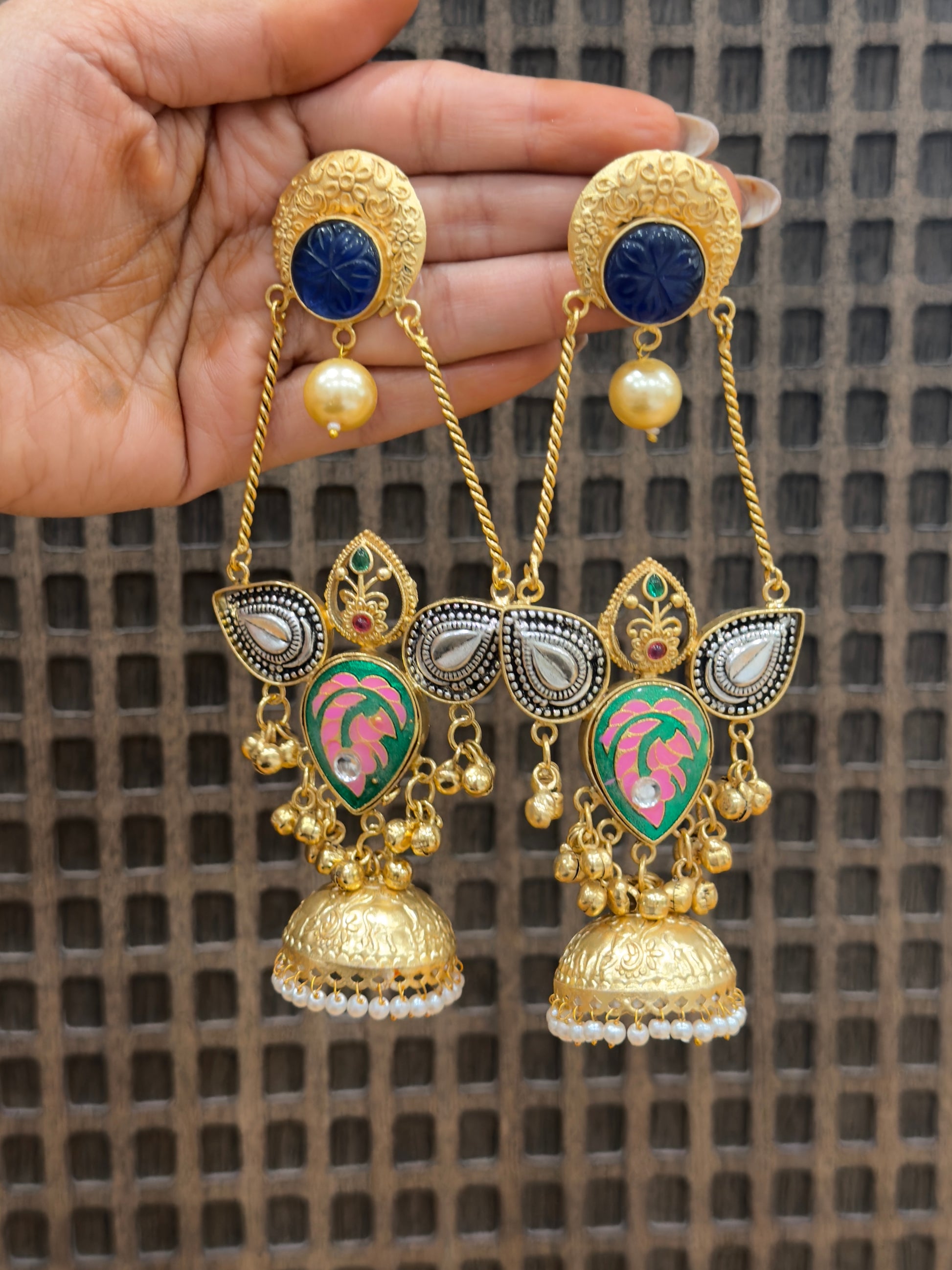 The long, elegant structure is enhanced with carved floral details, cascading ghungroos, and beautifully etched jhumka drops that sway gracefully with every movement. Ideal for weddings, festive occasions, or cultural events, these earrings make a regal statement when paired with sarees, lehengas, or Anarkalis.