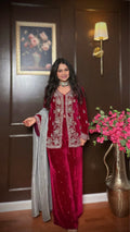 Ruvanya is a statement velvet palazzo suit designed for grand festive and evening occasions. Crafted in rich velvet and adorned with detailed hand embroidery, this fully lined ensemble offers both structure and comfort. The flowy palazzo pants paired with a soft tissue dupatta create an effortlessly regal look that stands out with timeless elegance.