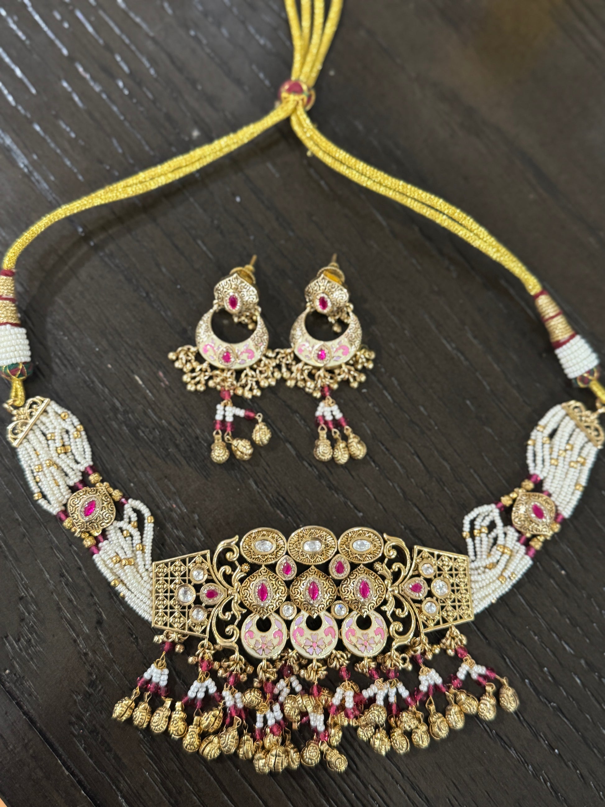 - Handcrafted brass choker with Kundan, enamel, and pearl detailing