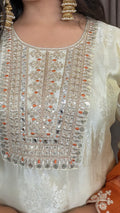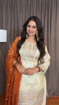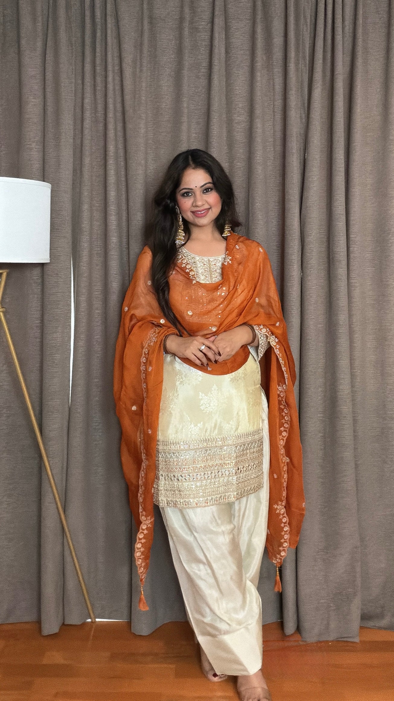 Embrace timeless elegance with the Sehira Farshi Suit. Crafted in ivory jacquard with zari and sequins embroidery, this set features a short-length kurta paired with the trending farshi salwar. The contrasting rust dupatta adds a bold festive touch, while the mulmul cotton lining ensures breathable comfort. A graceful blend of tradition and modern charm.