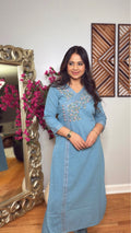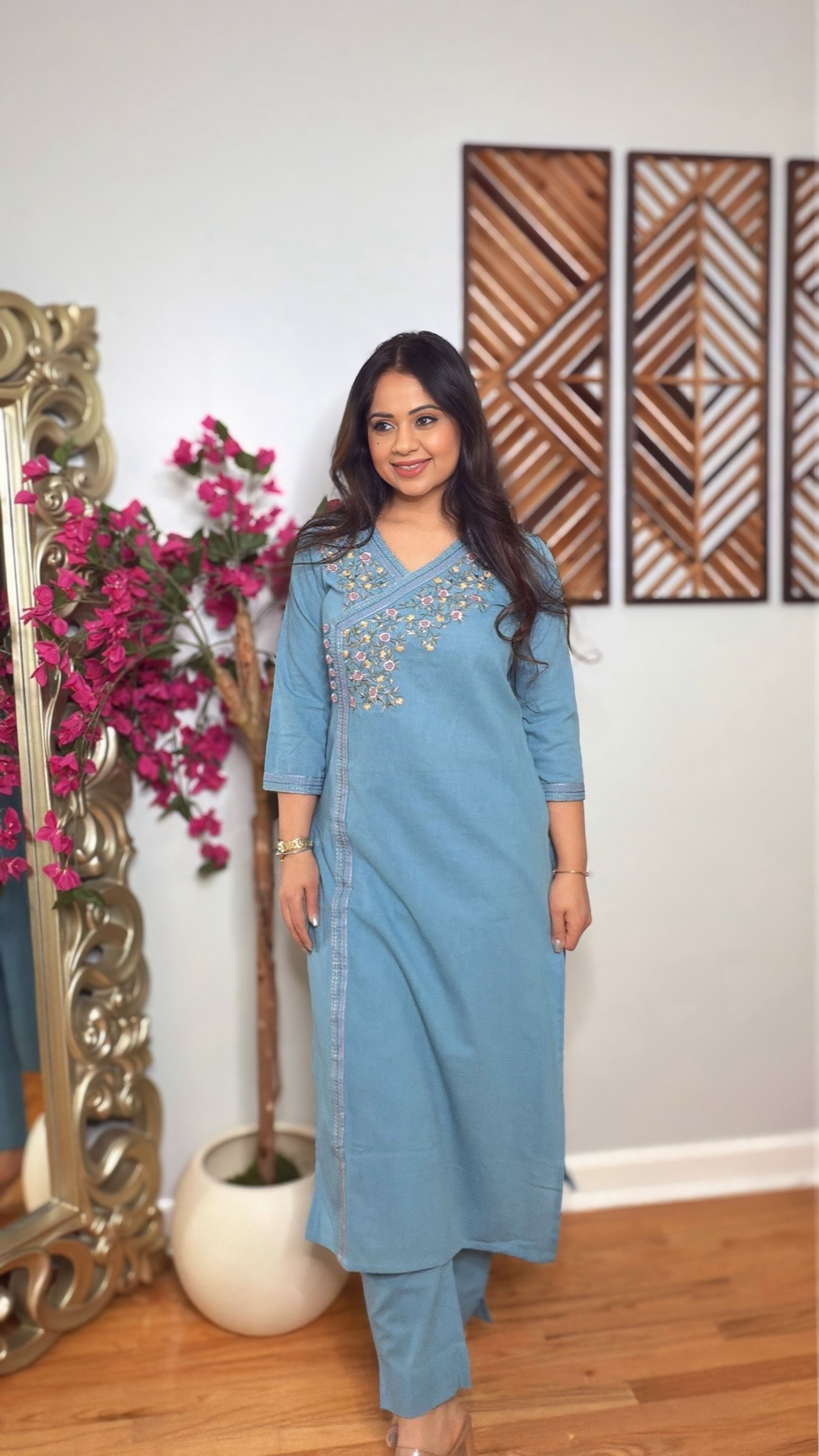 An elegant dusty blue linen cotton kurta set designed with delicate floral embroidery along the neckline and front panel. The asymmetrical wrap-style neckline with button detailing adds a modern ethnic touch, while the straight silhouette keeps the look timeless and comfortable. Paired with relaxed pants, this outfit is perfect for effortless everyday elegance.