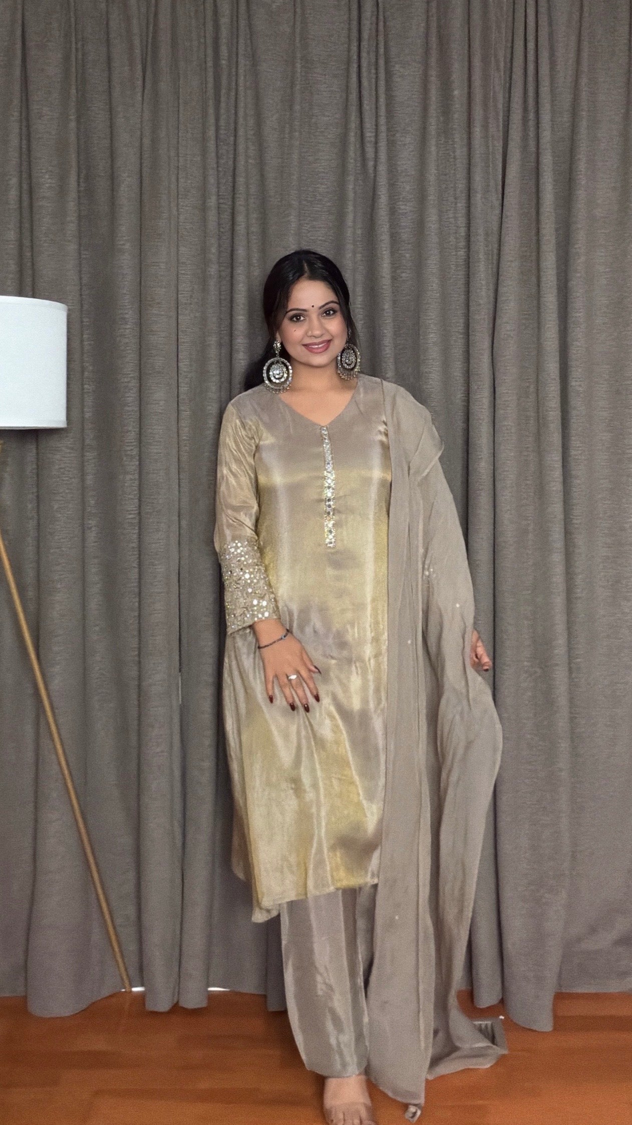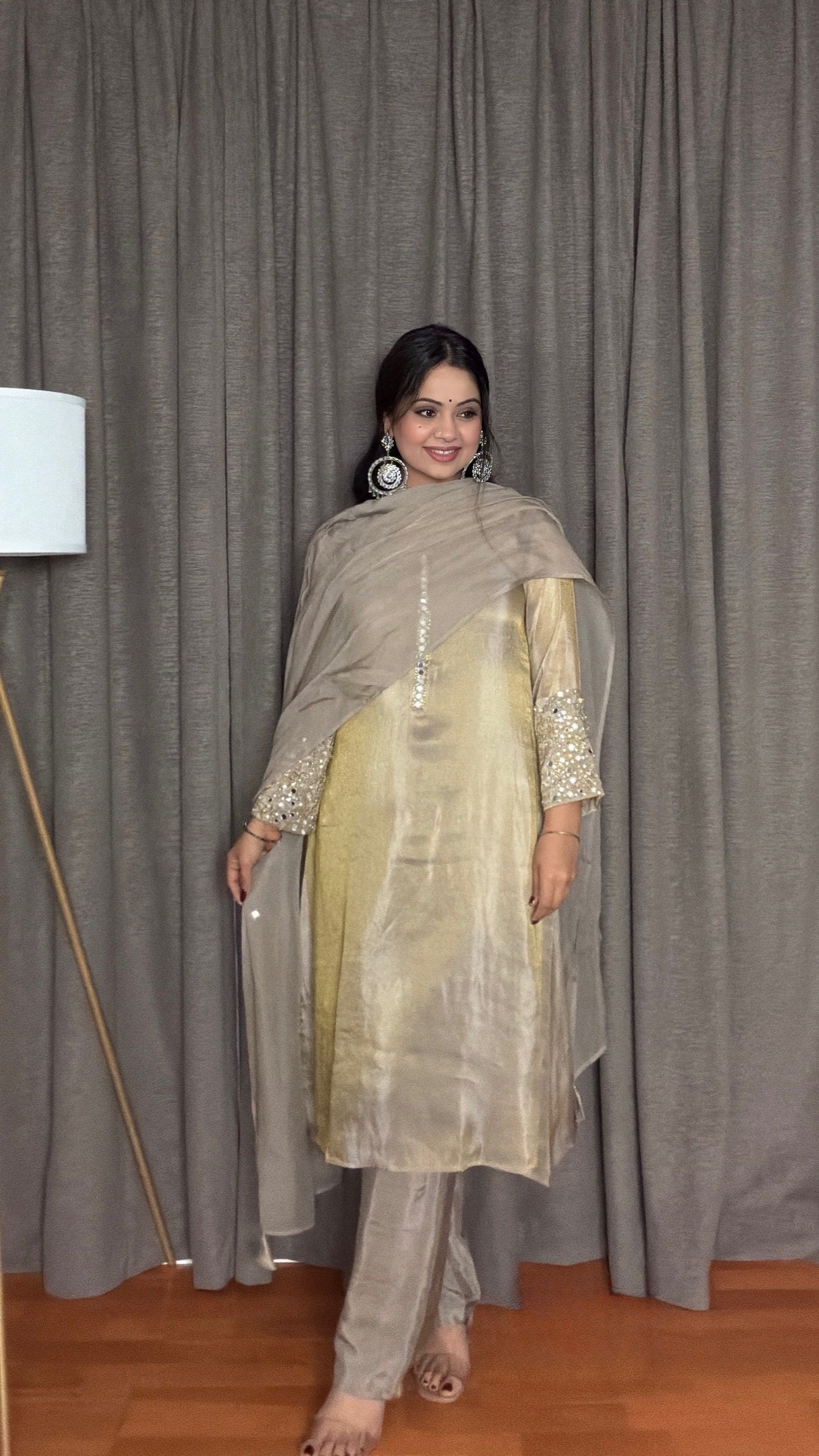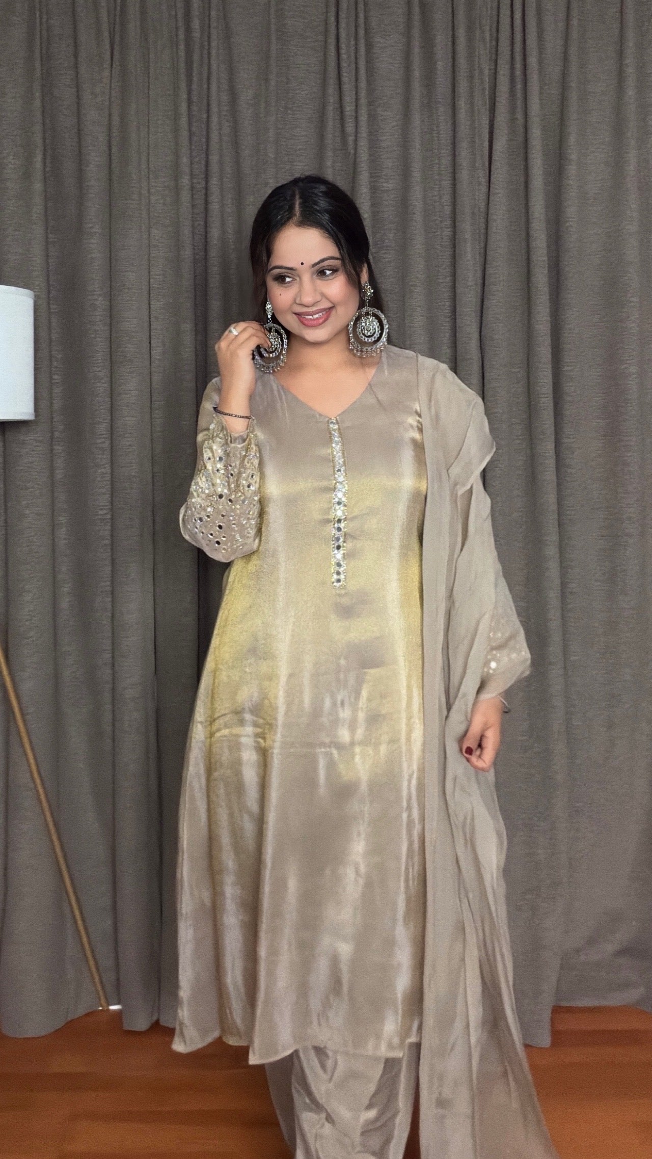 Crafted in lustrous tissue shimmer fabric, this A-line Anarkali in a serene nude hue is enhanced with real mirror and cutdana hand embroidery along the neckline and sleeves — adding a subtle sparkle that catches every light.