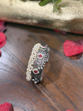 Infuse vintage sophistication into your look with the Tara Oxidized Pearl & Ruby Handcuff, a handcrafted piece that radiates ethnic elegance. Made from high-quality brass with a rich oxidized silver finish, this openable cuff showcases intricate floral engravings adorned with ruby-red stones and rows of delicate pearl accents.