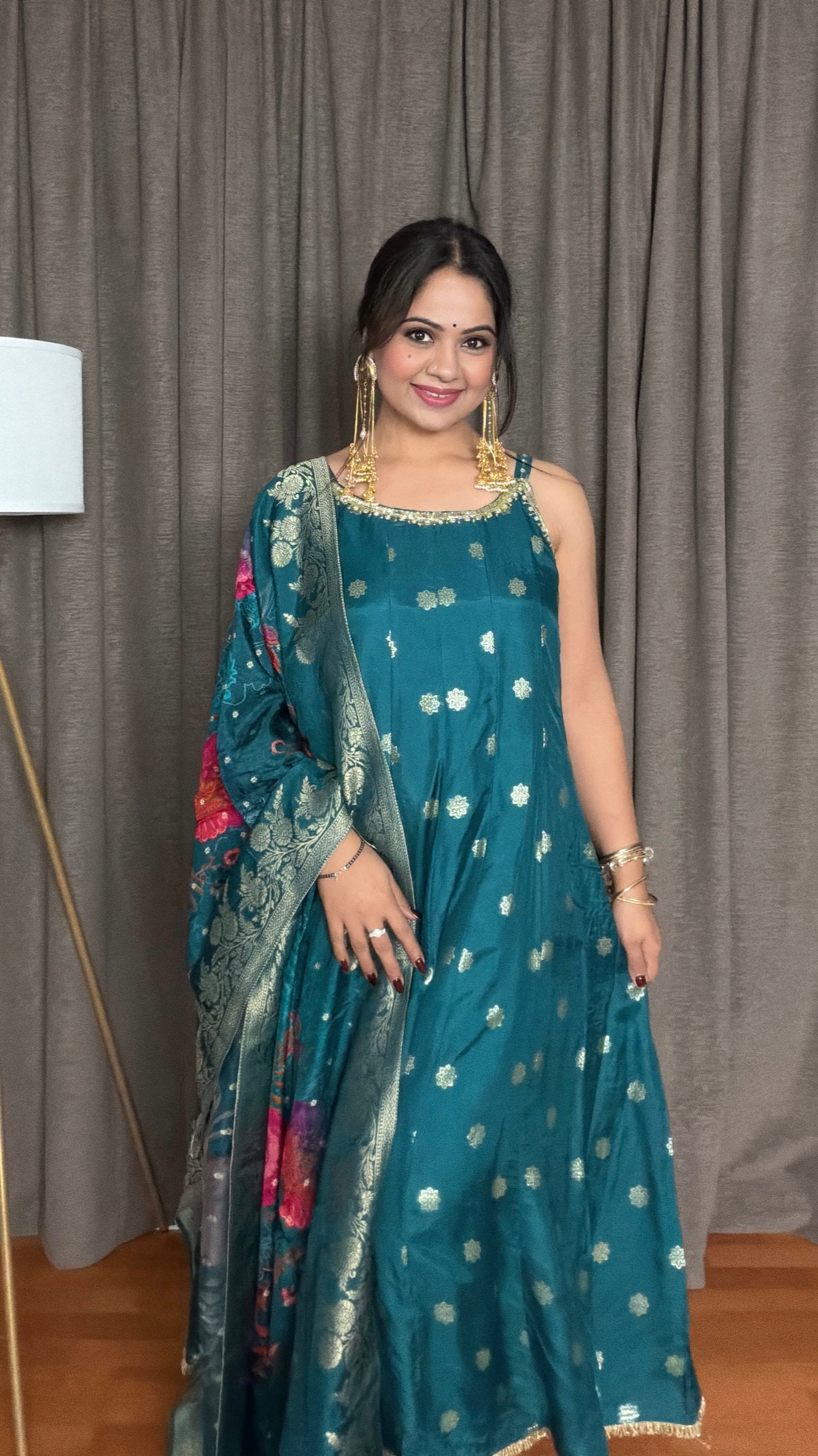 Step into elegance with Teal Bloom, a stunning teal blue dola silk strappy Anarkali suit designed for festive sophistication. The 47-inch Anarkali features delicate zari weaving and exquisite handwork embroidery along the neckline, complemented by a deep back neck for a graceful, feminine touch.